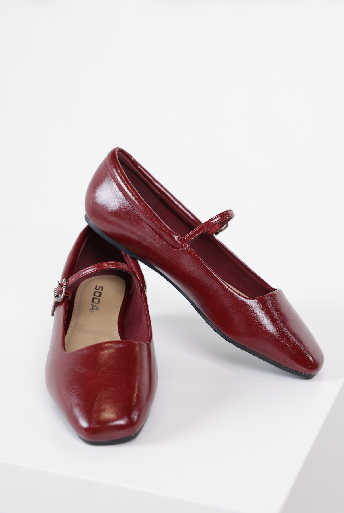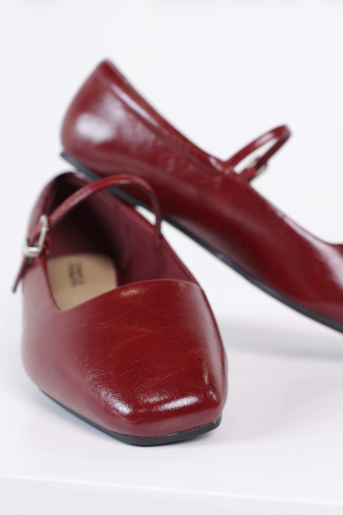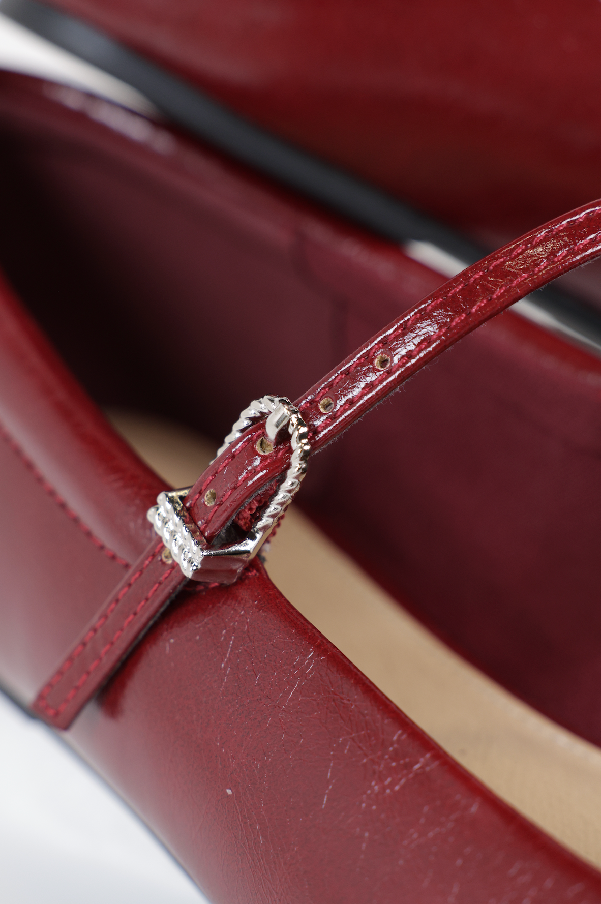 Red square toe flats with a strap and buckle detail, designed as a polished and modern everyday shoe.