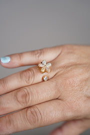 A delicate gold-tone ring featuring a crystal-studded floral design and a single shimmering gem for a playful yet elegant touch.