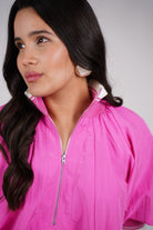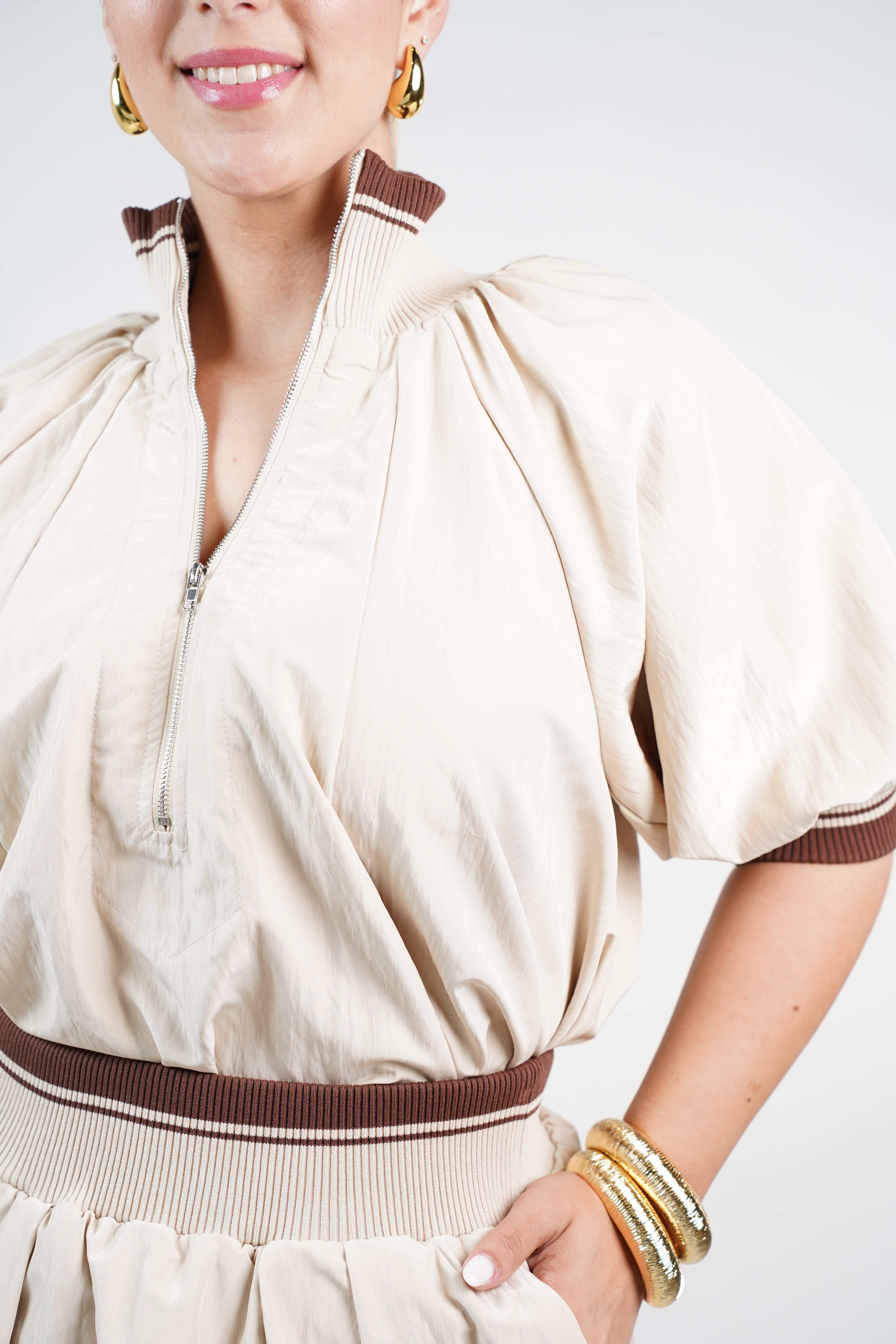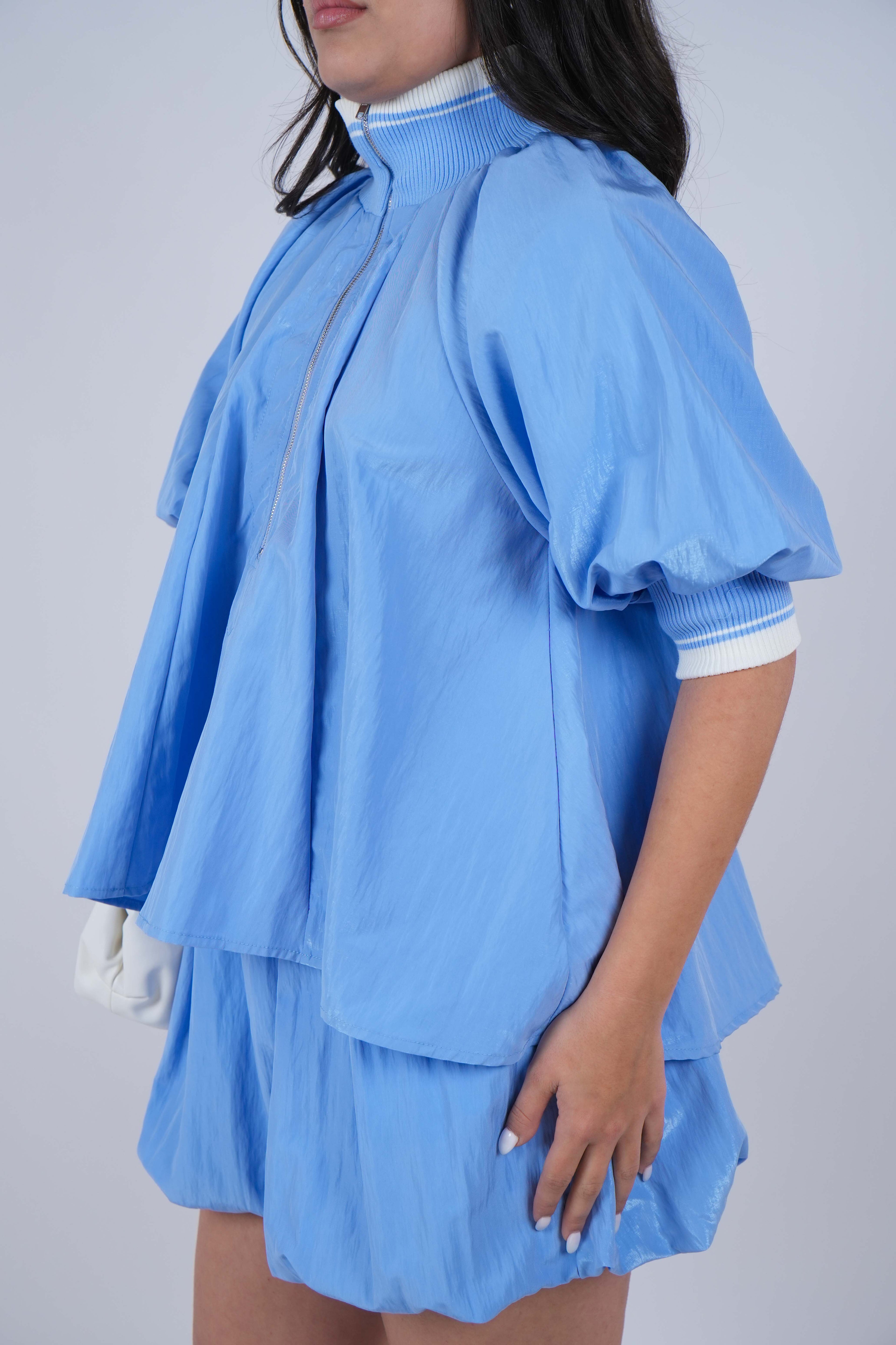 Cropped top with short puff sleeves and a modern zip-front detail