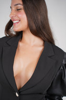 A bold and elegant mini blazer dress designed with dramatic puff sleeves and crystal-style buttons for a powerful, ultra-chic statement.