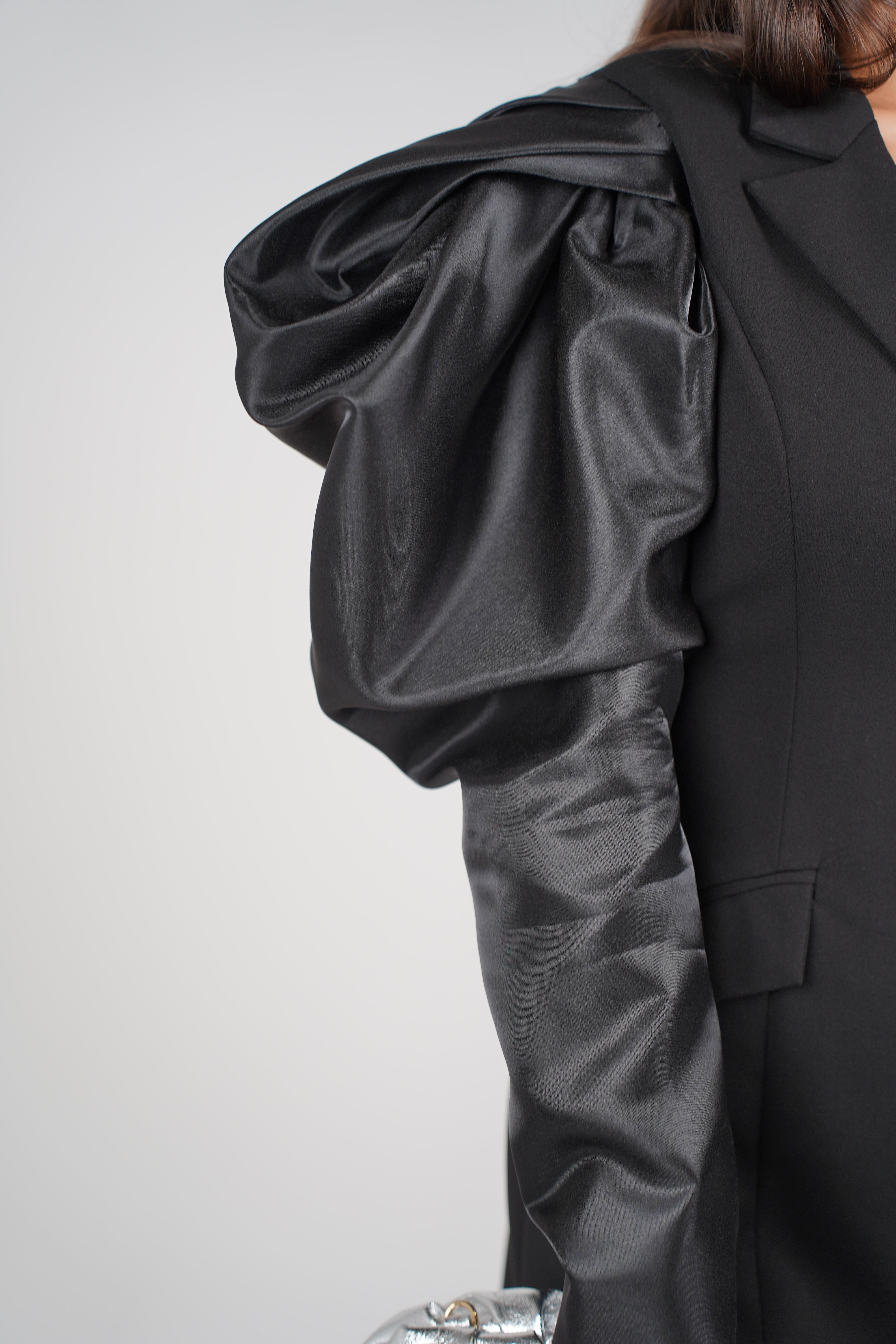 Sleeves: Long puff sleeves with satin-like finish