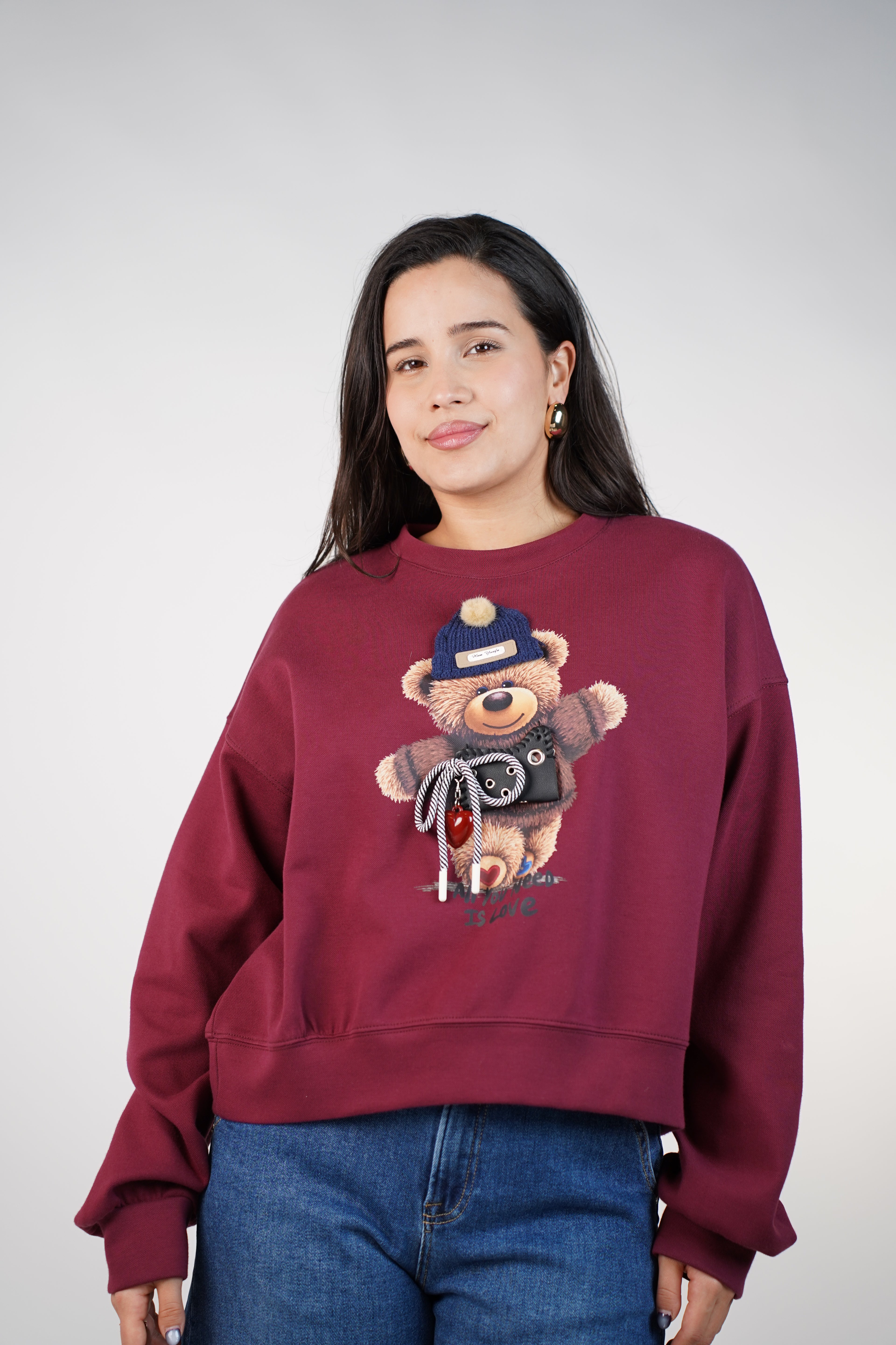 The HoneyBear Heart Sweater combines softness, charm, and a touch of whimsy in one must-have piece. Featuring a lovable bear graphic with a fuzzy beanie and a 3D pouch-style detail tied with rope accents, this sweater instantly adds personality to your look. The rich burgundy tone makes it a standout for casual days, cozy afternoons, or playful outfits that spread joy. Its relaxed fit and ultra-soft feel make it perfect for pairing with denim, leggings, or joggers for an effortlessly cute, comfortable style.