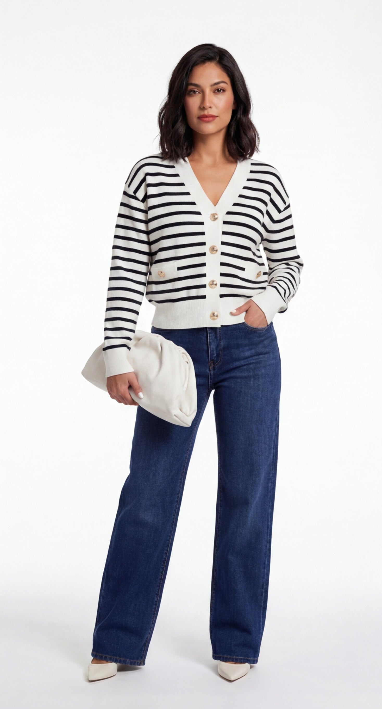A striped knit cardigan with refined detailing and a flattering silhouette—designed for elevated layering and everyday sophistication.