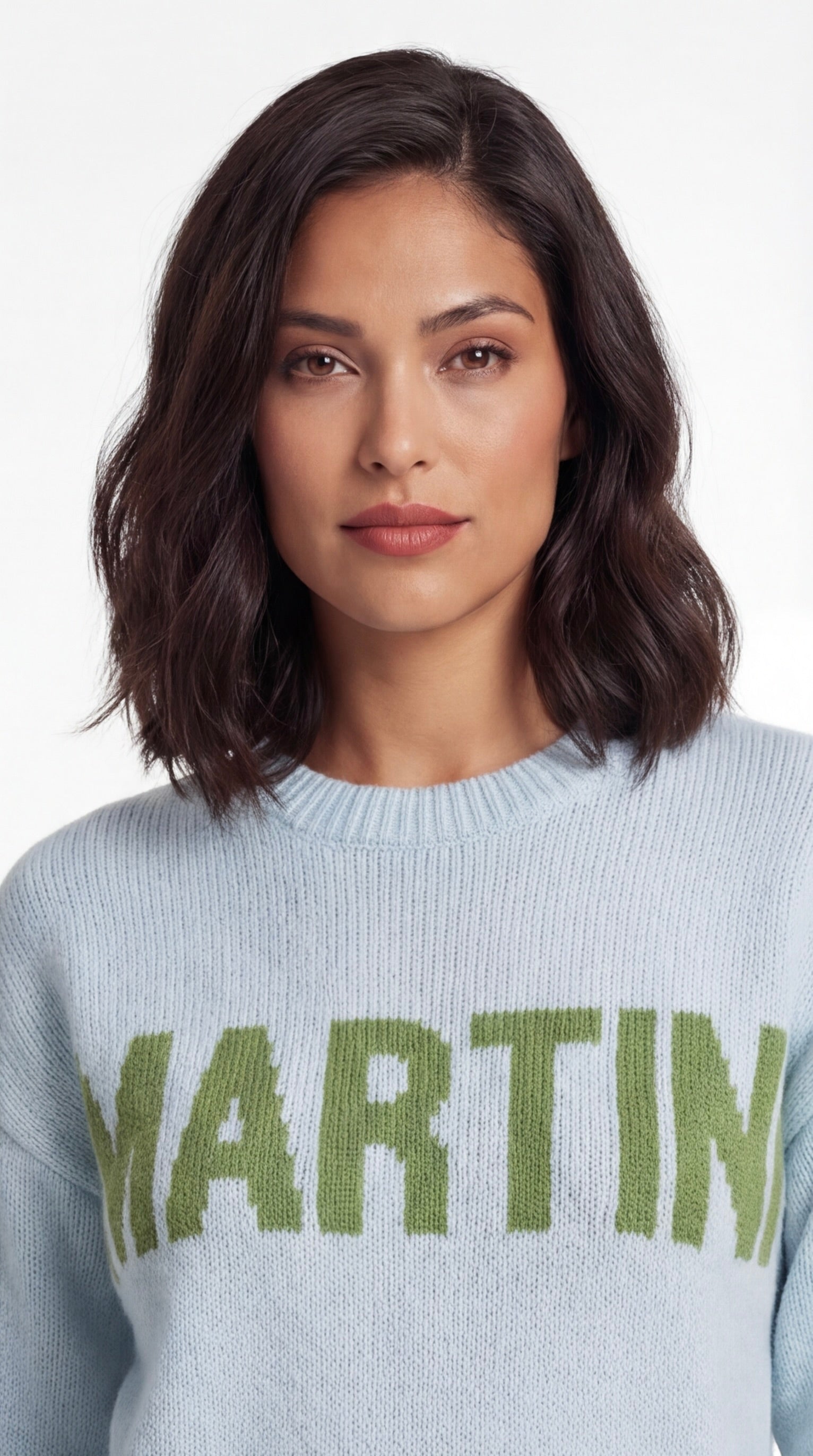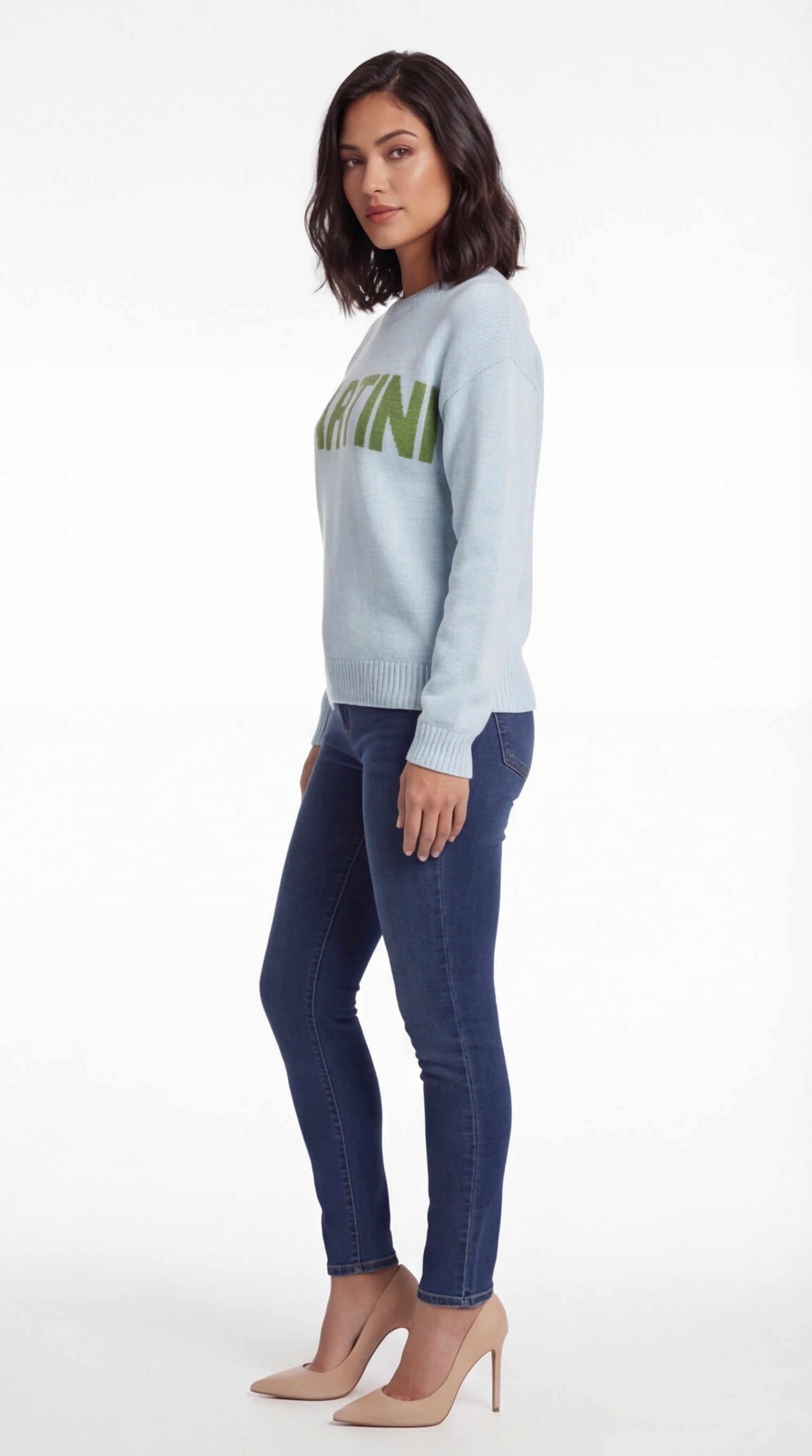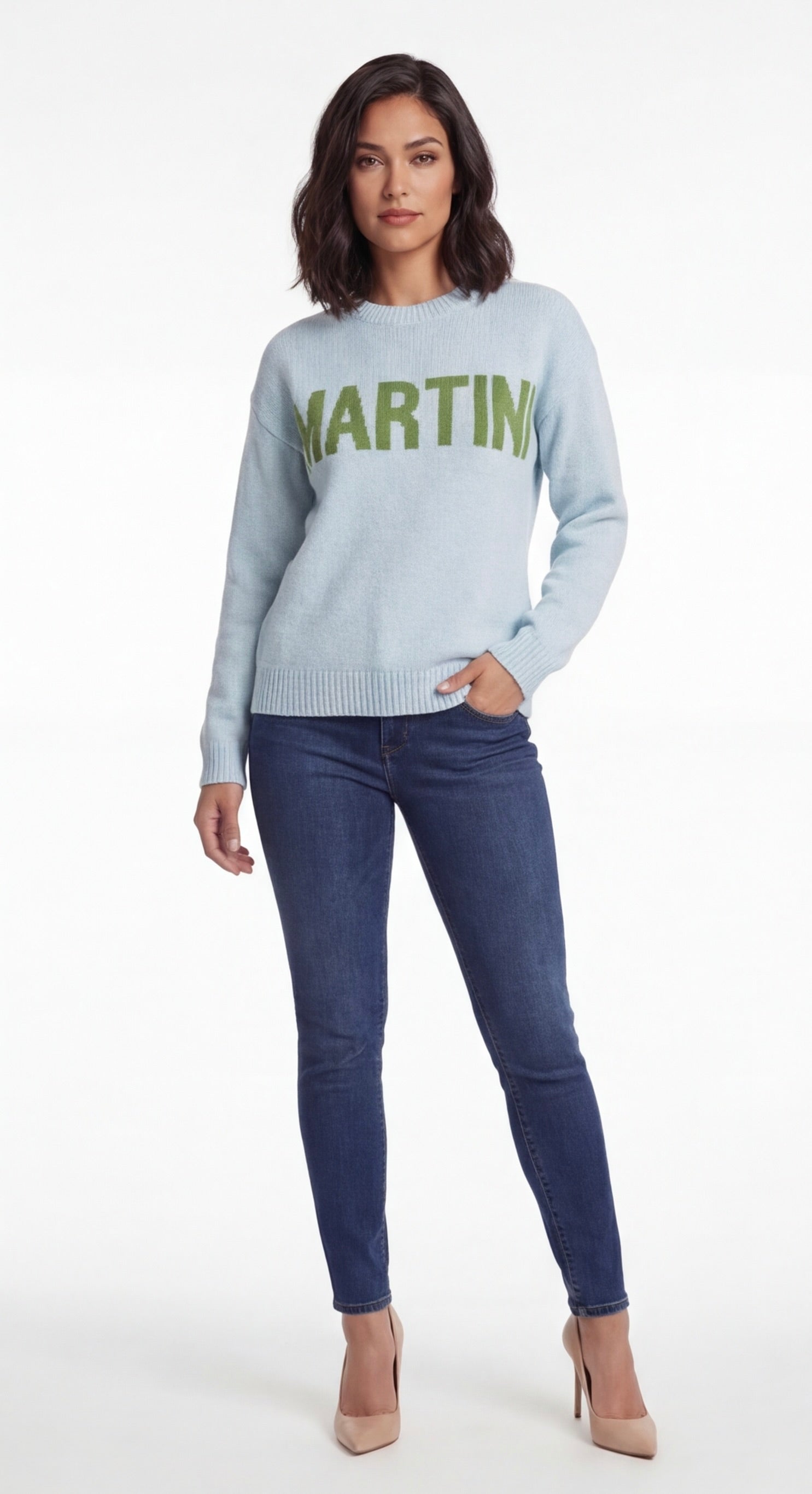 Model wearing light blue knit sweater with green martini lettering, crew neckline, and ribbed trim.