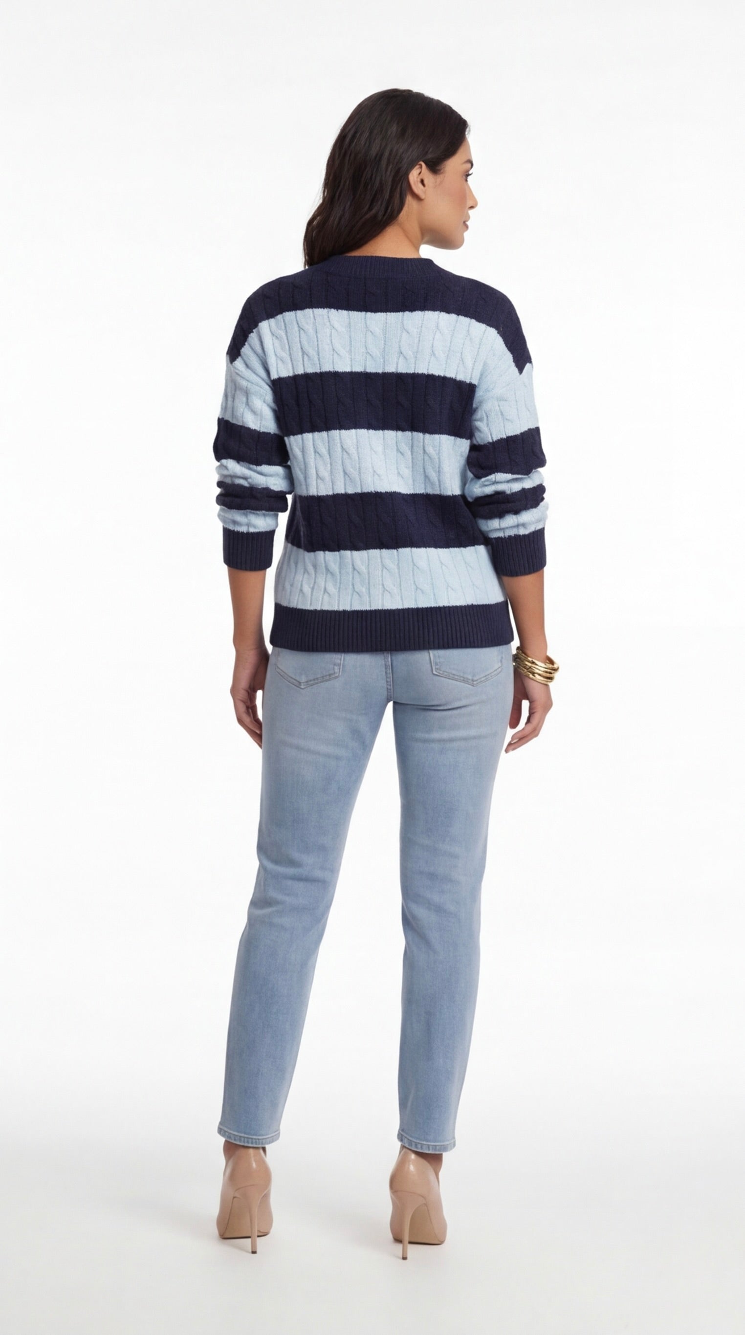 A timeless striped cable-knit sweater with refined structure—designed for elevated everyday wear and seasonless styling.