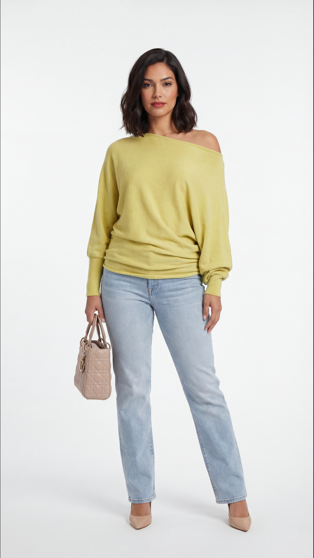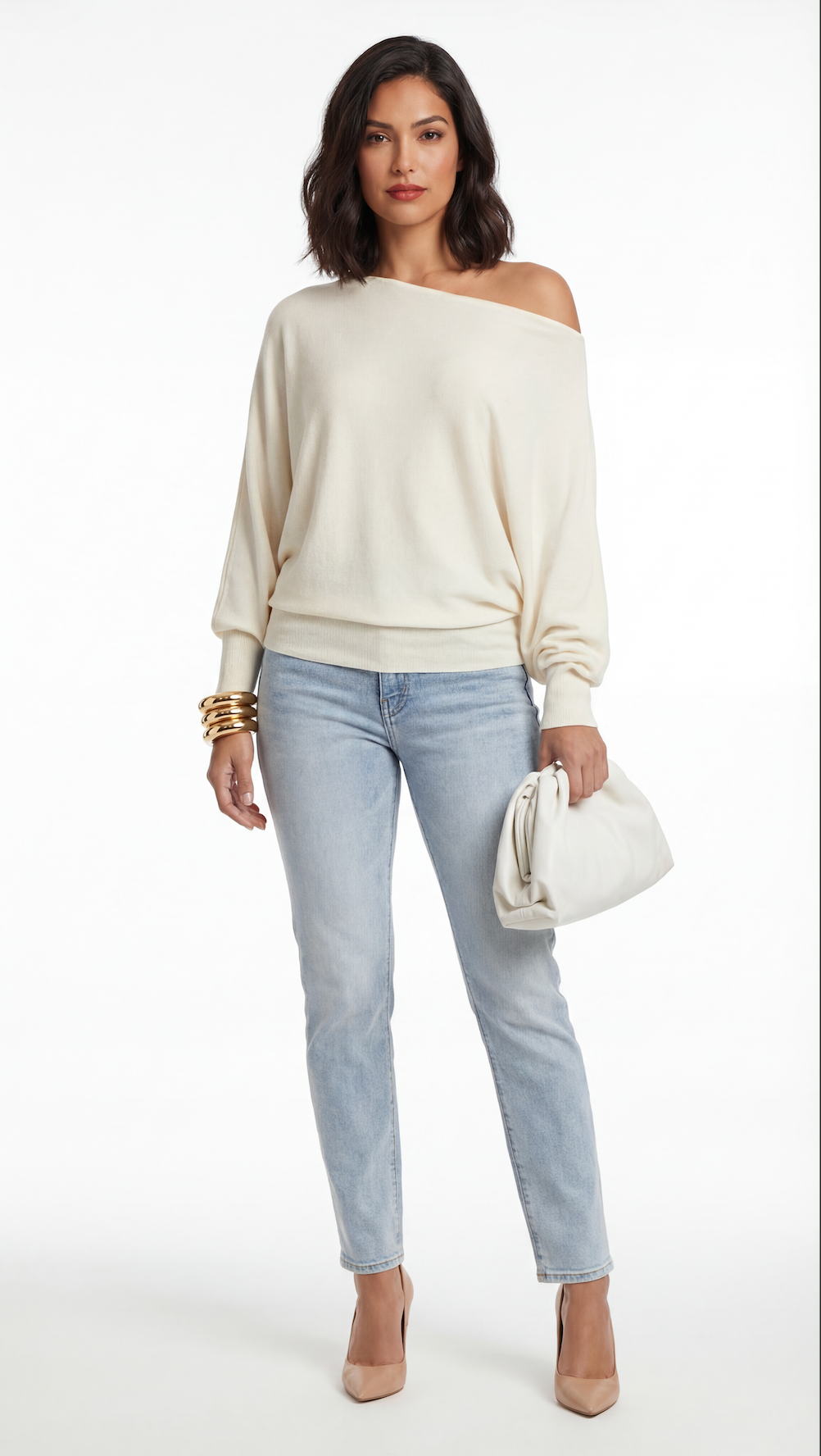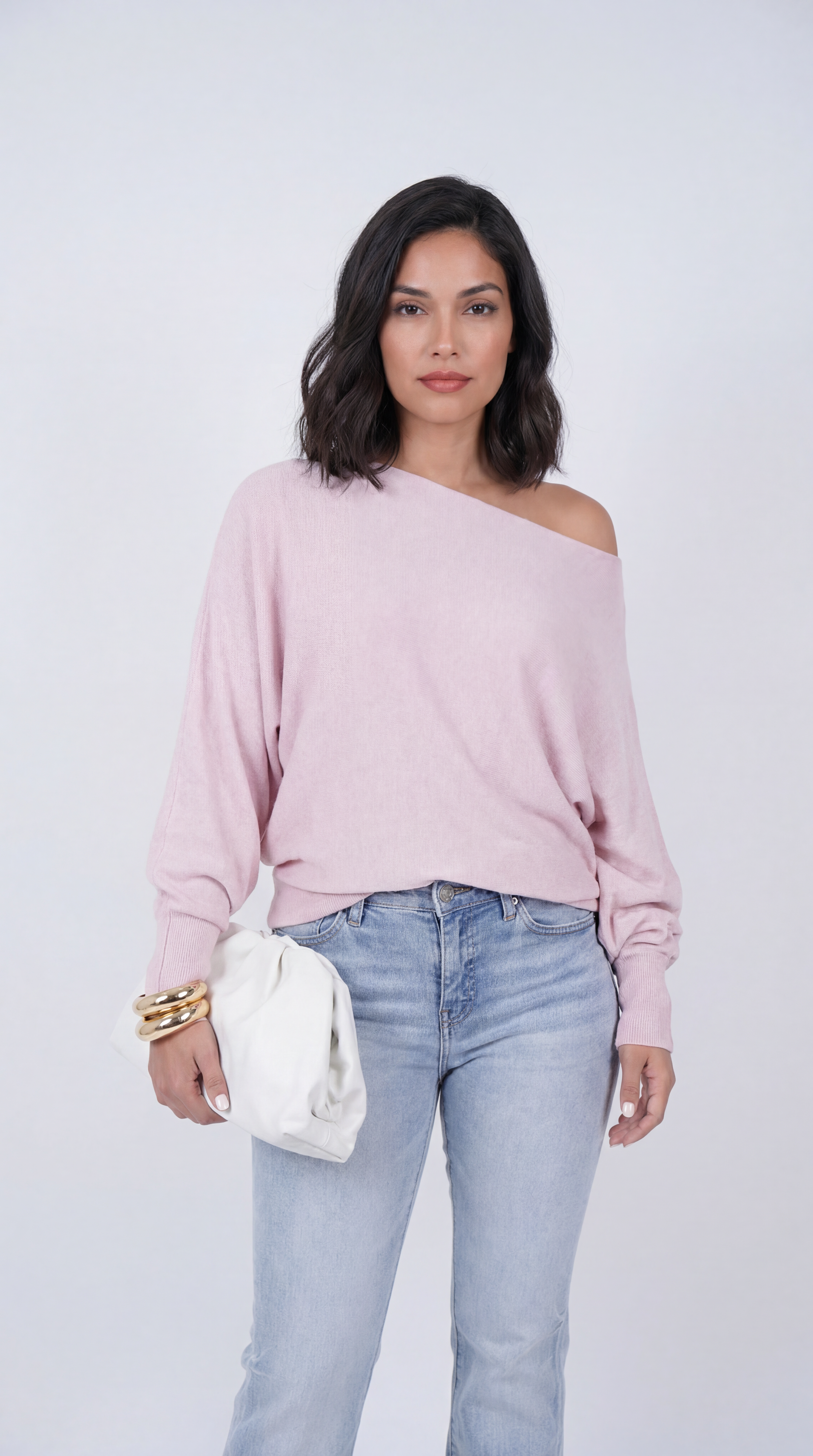 Soft knit sweater in a relaxed off-shoulder silhouette worn with light-wash jeans on a model against a neutral background.