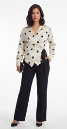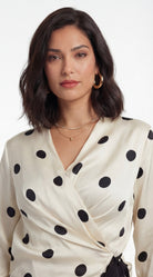 Model wearing ivory polka dot wrap blouse with V-neckline, long sleeves, and side tie detail.