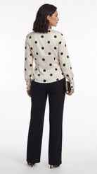 Polka dot wrap blouse with a fluid drape and elegant tie detail. A timeless investment piece for refined, modern styling.
