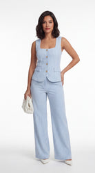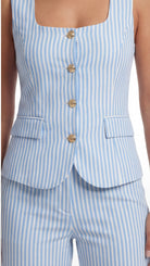Blue and white striped vest set with a sleeveless tailored top and wide-leg pants, styled with heels for a modern elegant outfit.