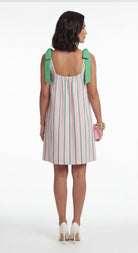 The Liraen Mini Dress features soft stripes and adjustable tie shoulders, offering a fresh and feminine warm-weather look.