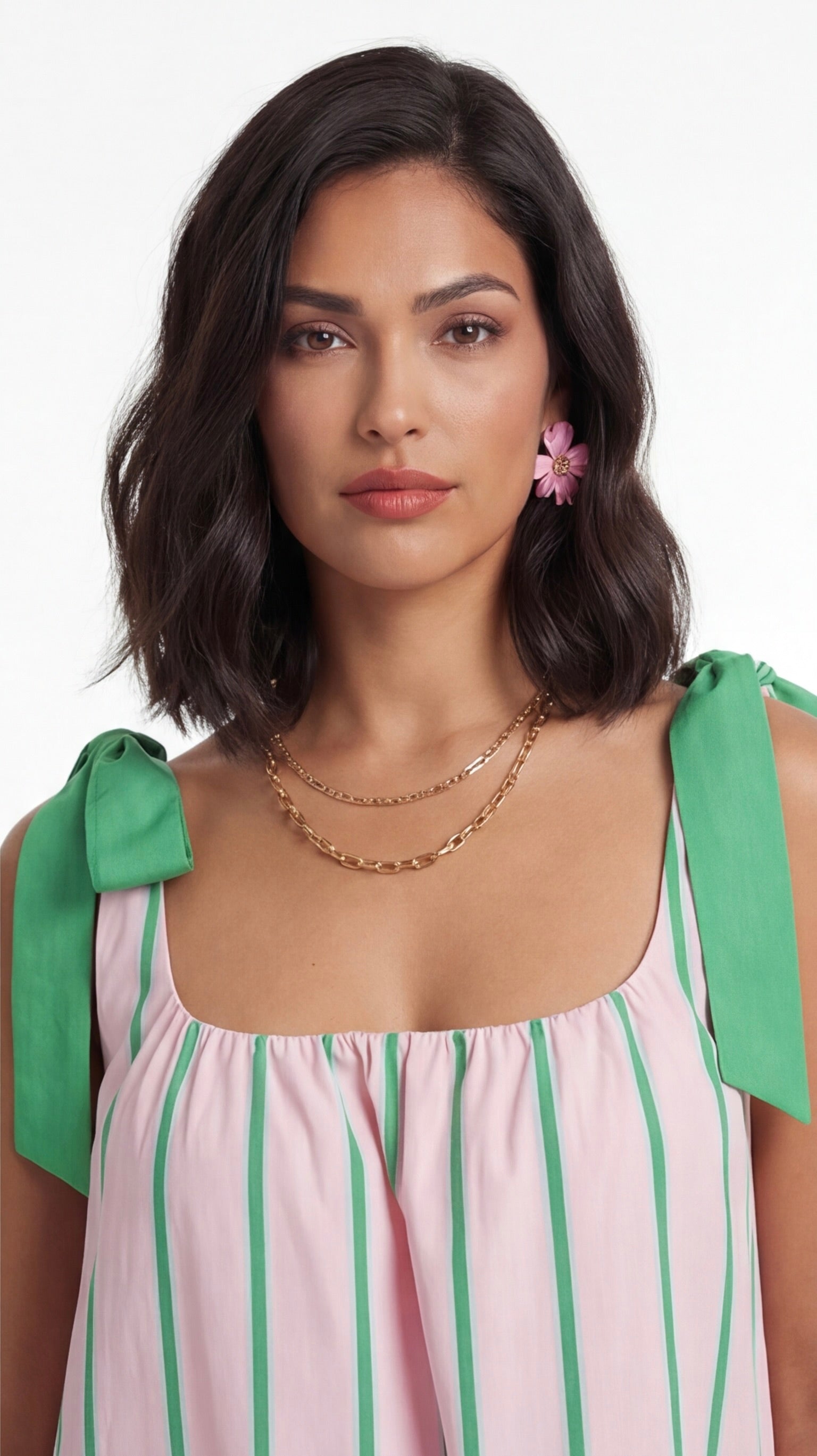 Pink mini dress with green vertical stripes and tie shoulder straps, styled with heels for a playful and elegant outfit.
