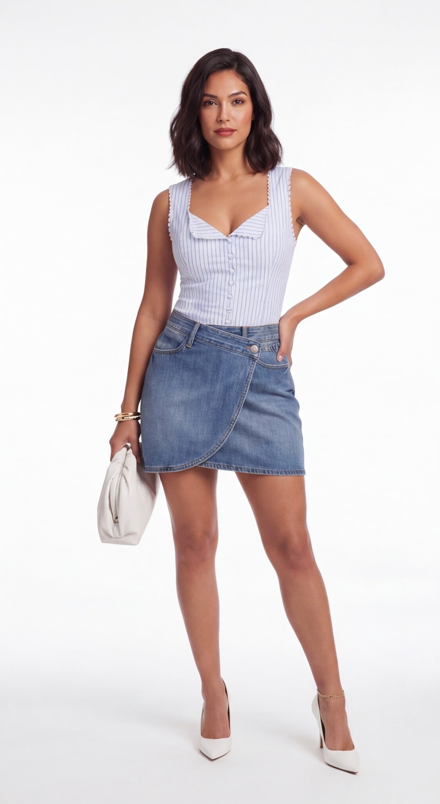 The Llyra Wrap Mini Denim Skirt redefines casual structure with a modern, asymmetric edge. A curated Investment piece designed to bring effortless polish to everyday denim styling.