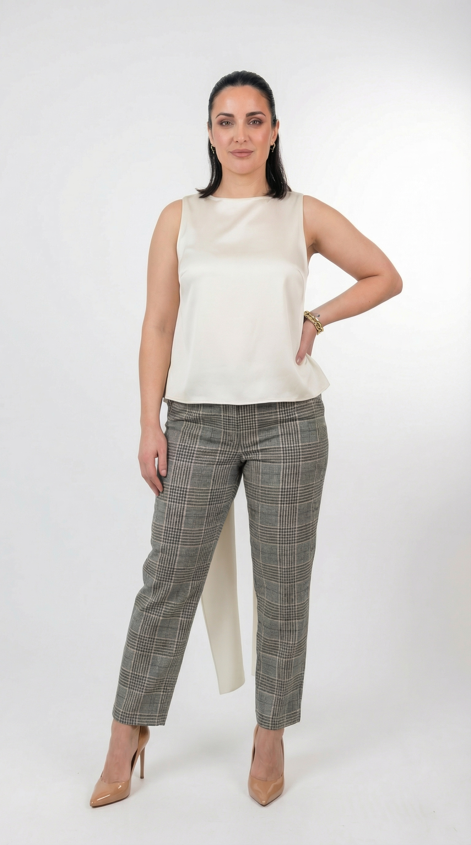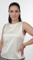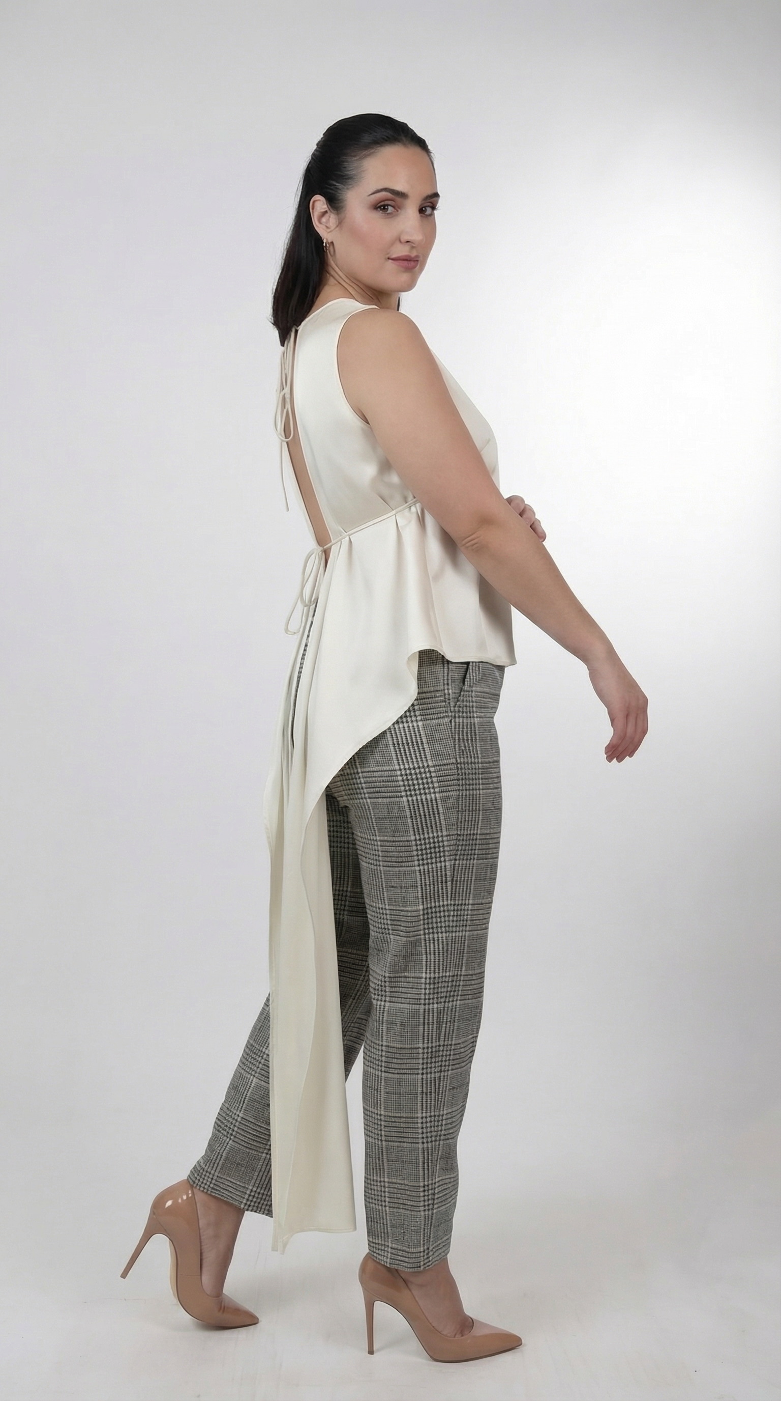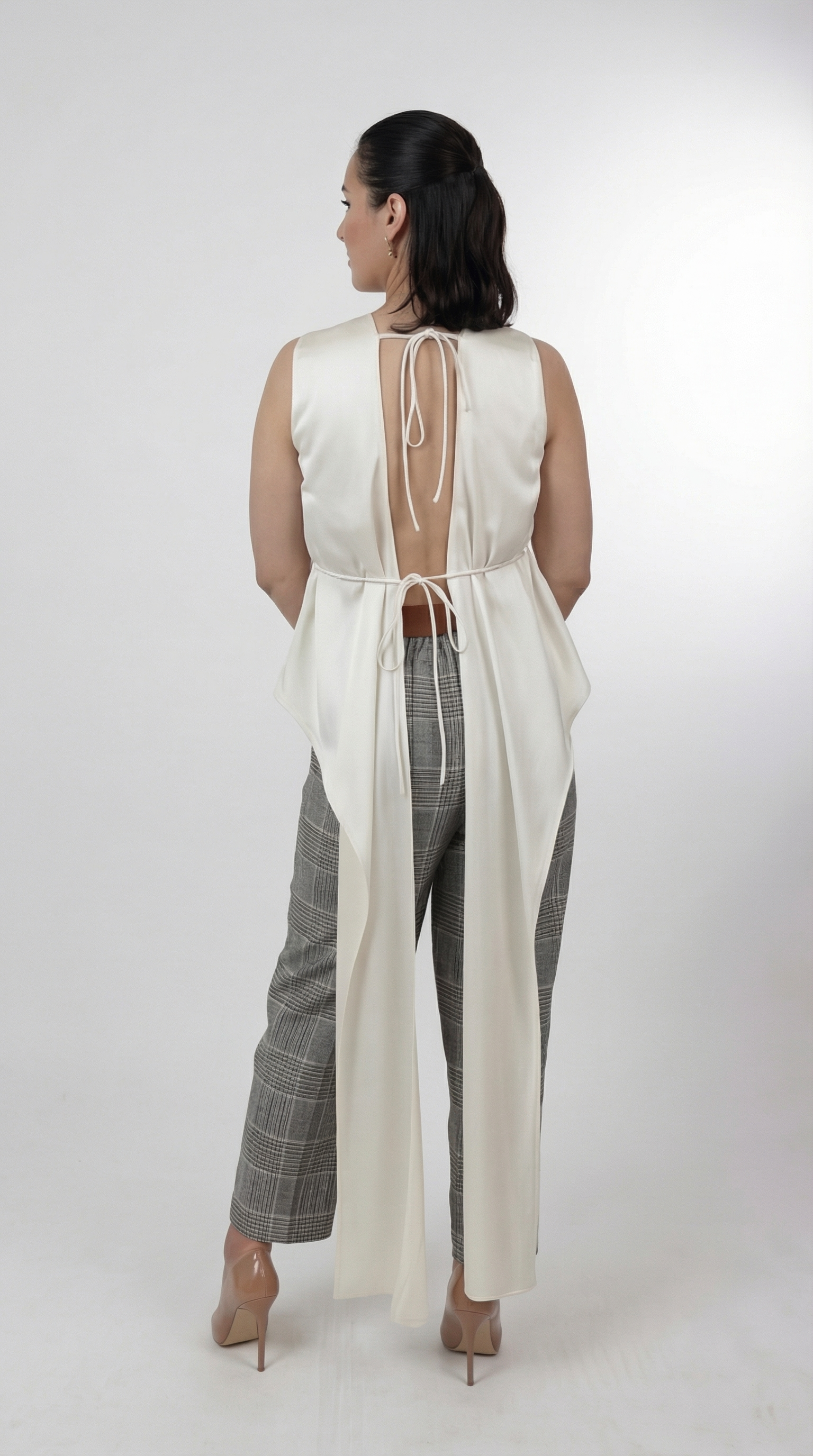 Ivory satin sleeveless blouse with open back tie detail and long draped panels, styled with tailored pants.