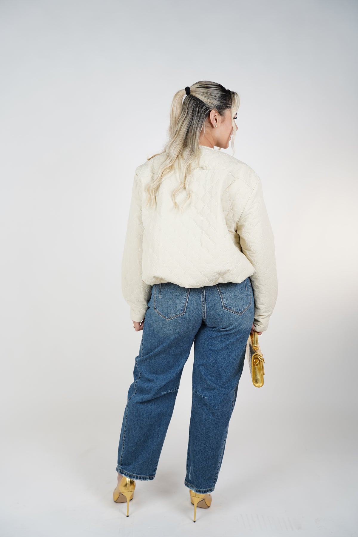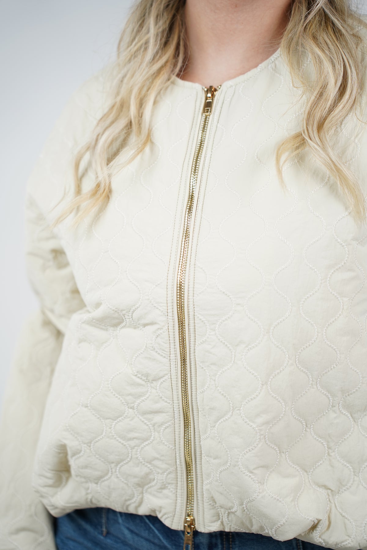 Shop the Velira Quilted Jacket, a chic lightweight quilted layer with modern wavy stitching and a gold zipper. Perfect for everyday styling. Available now at Carema Boutique.