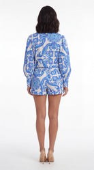 The Zelix Stamped Shorts Set features a bold blue print with a structured blouse and relaxed shorts for a refined statement look.
