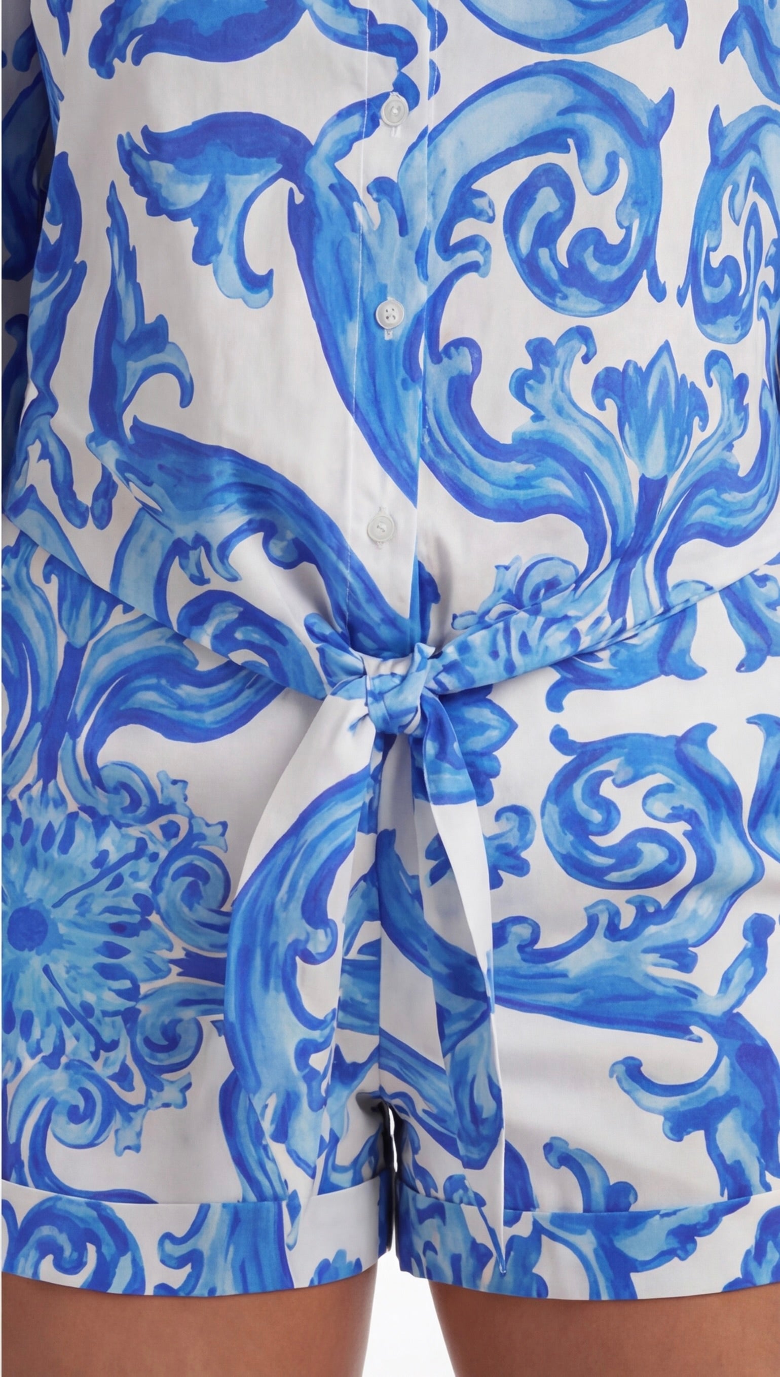 Blue and white printed two-piece shorts set with a button-up blouse and high-waisted shorts, styled with heels for a bold, elegant outfit.