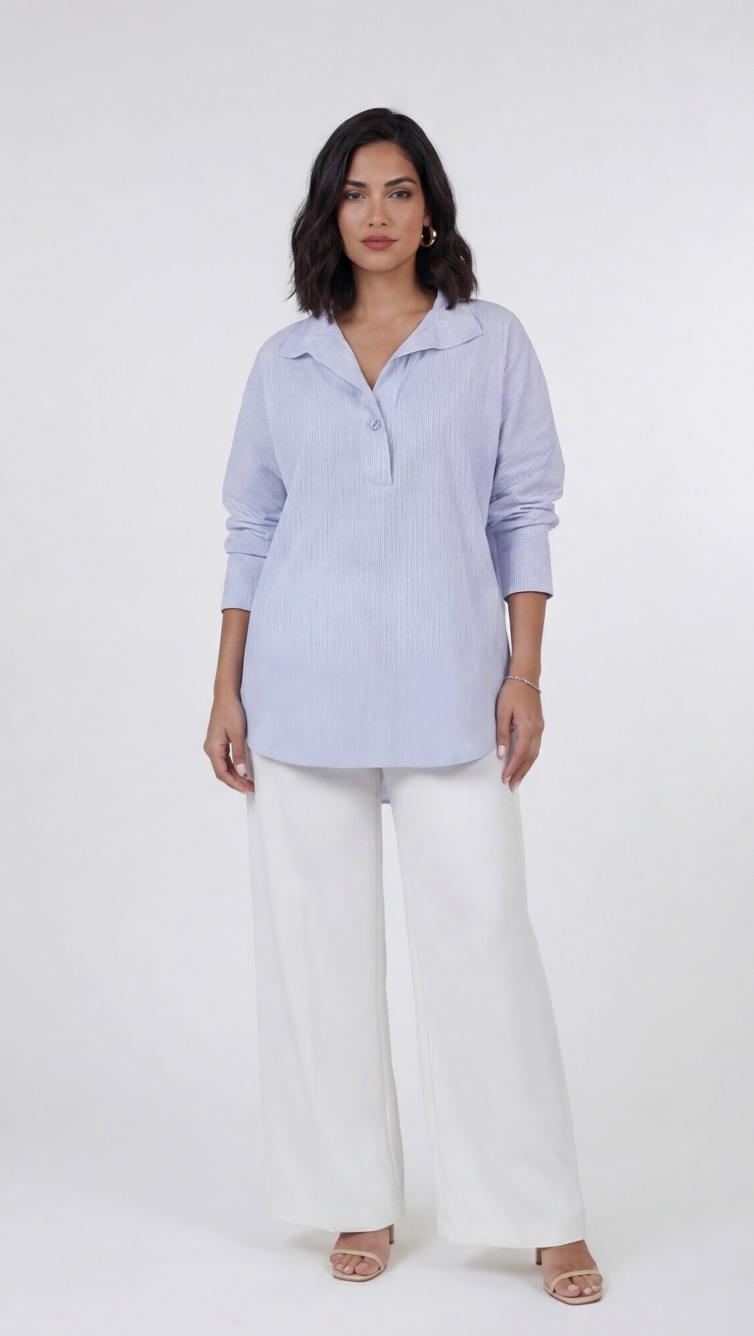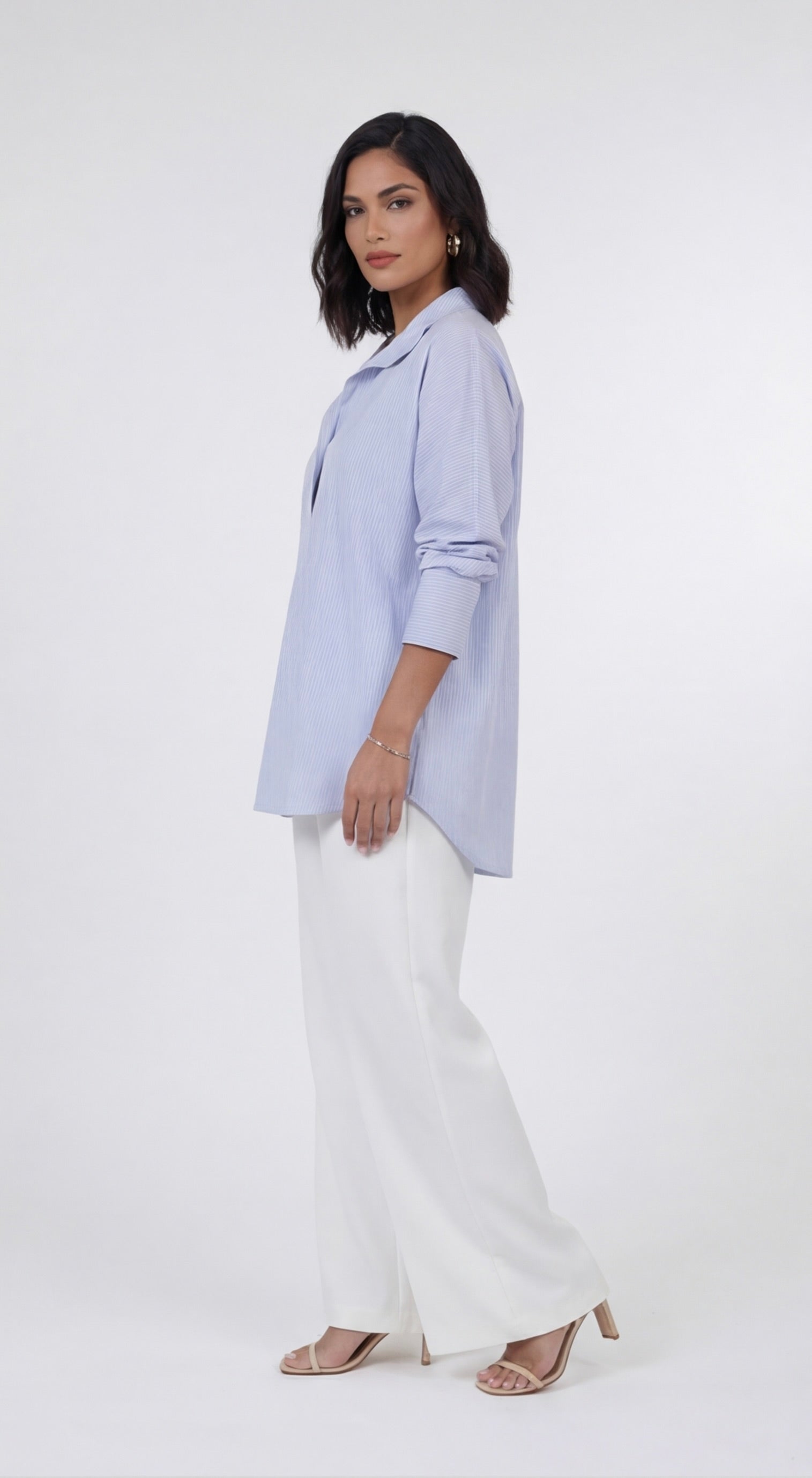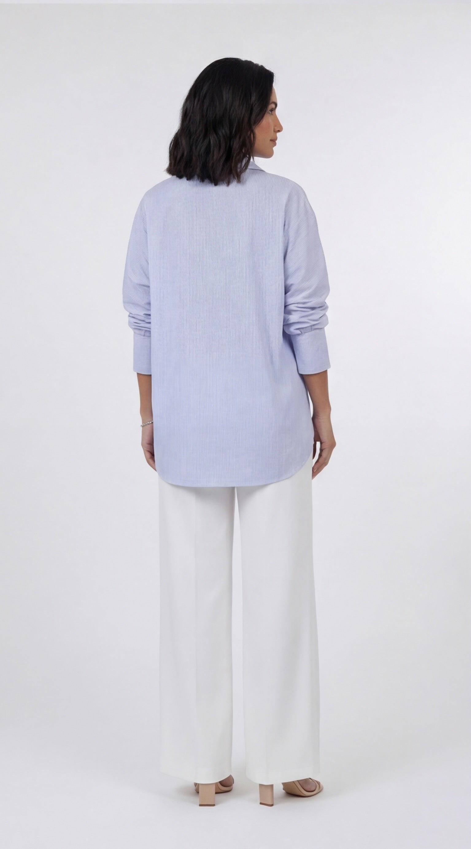 Blue striped oversized shirt with a soft collar and wide cuffs, styled for a relaxed and modern elegant outfit.