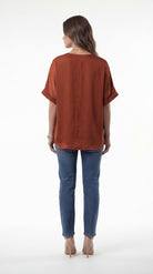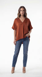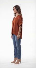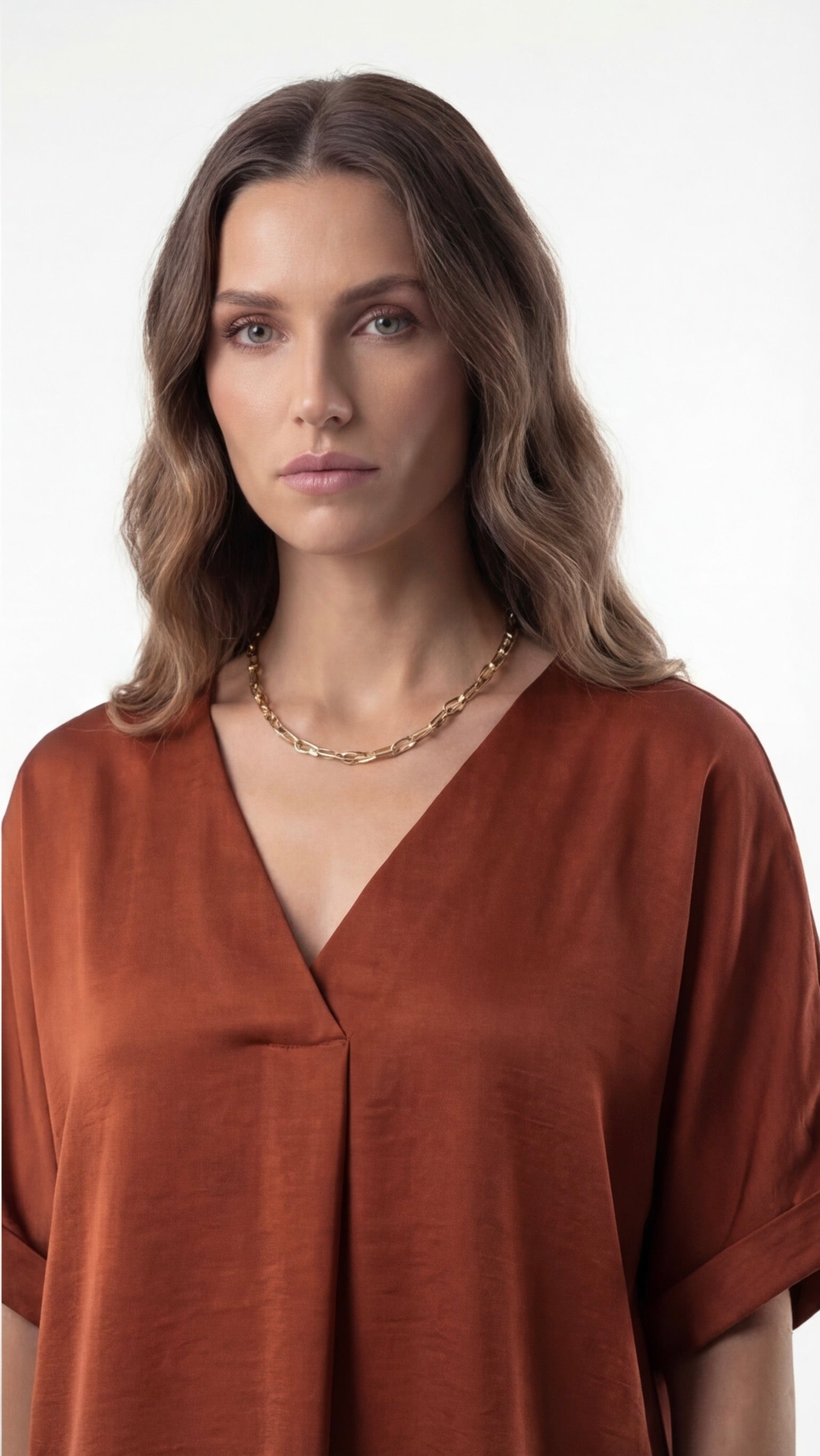 Rust satin V-neck blouse with relaxed fit and rolled sleeves styled with denim and gold jewelry.