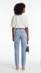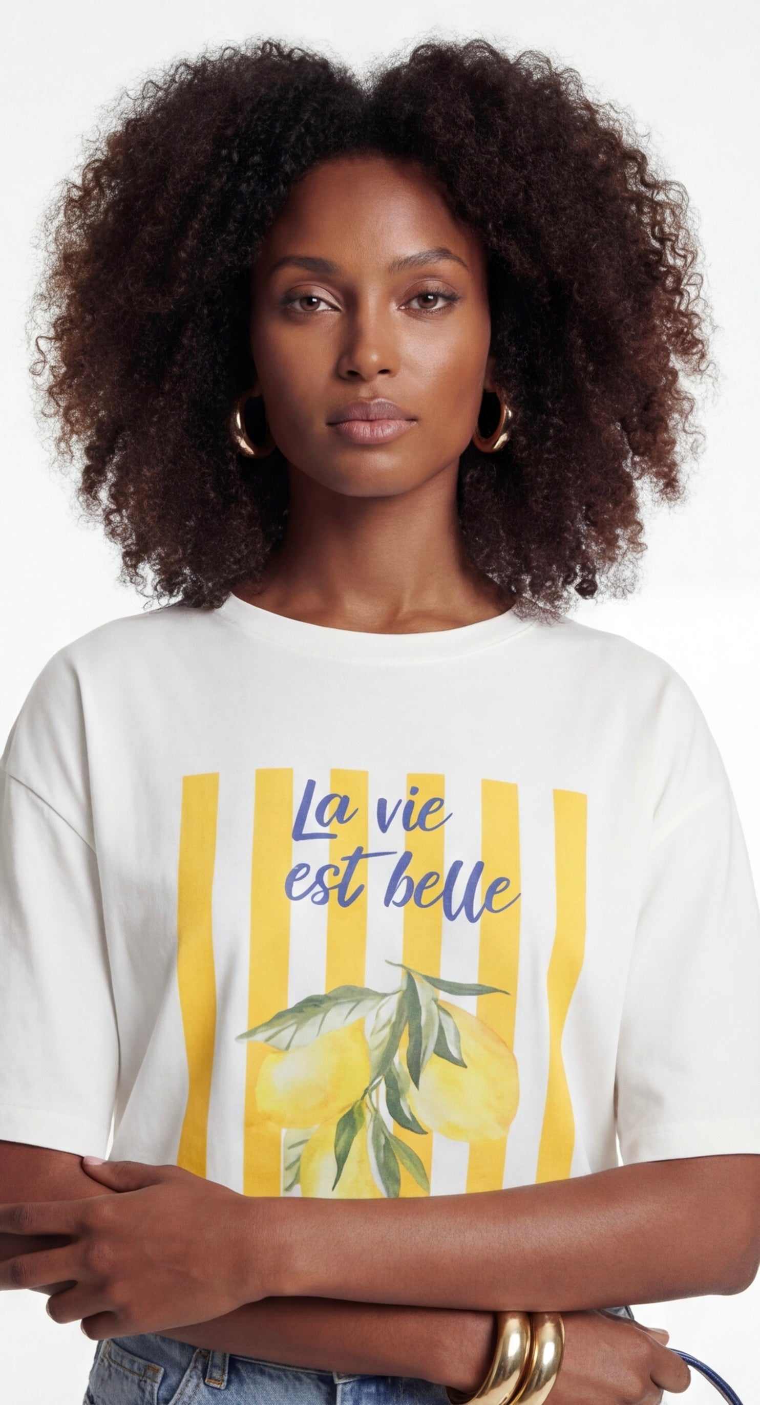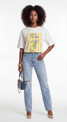 White graphic t-shirt with lemon illustration and yellow stripes, styled with denim for a fresh casual look.