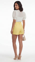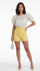 White textured blouse with puff sleeves and intricate embellishment, styled with tailored shorts for a refined elegant look.