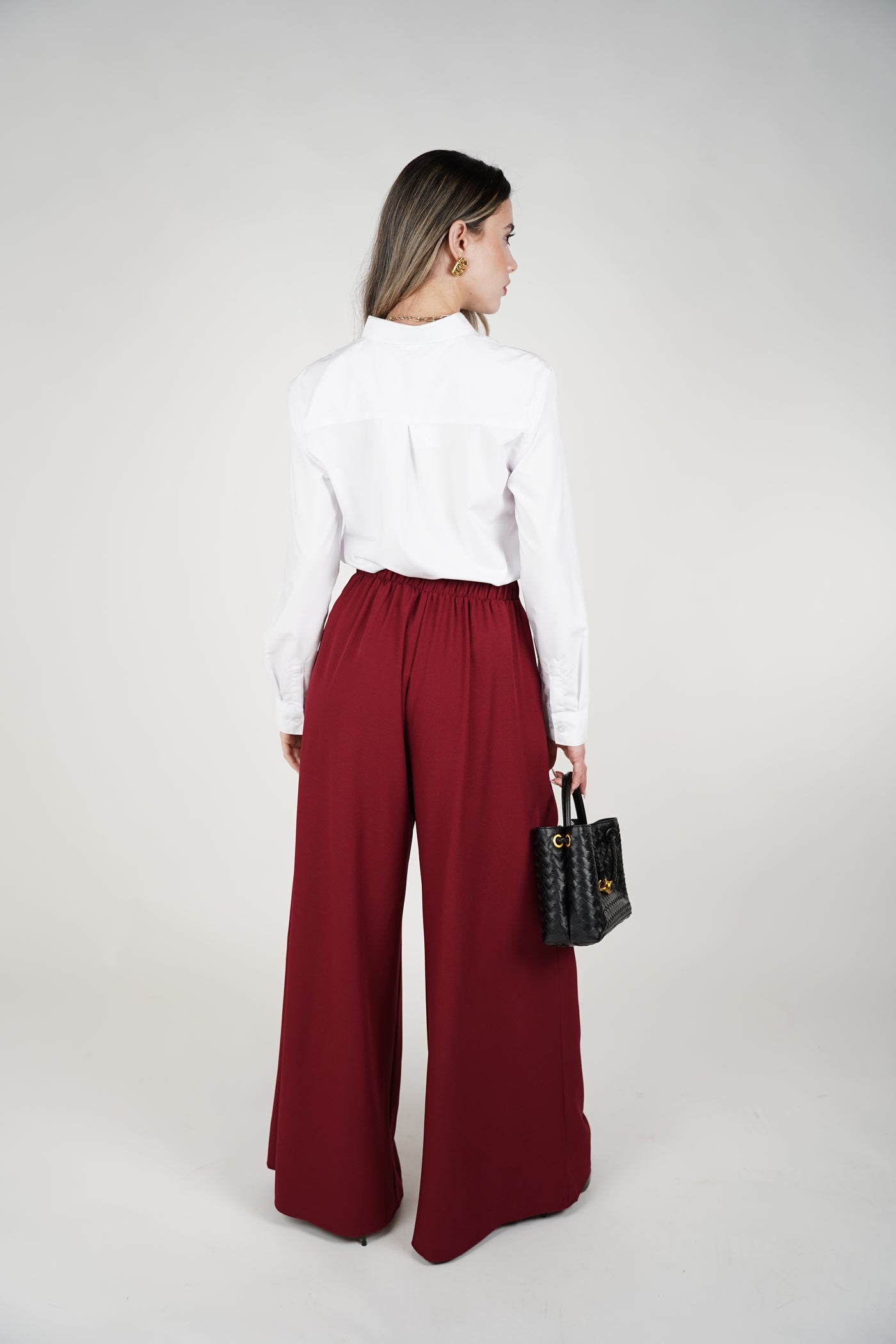 Luven Wide Leg Pants – burgundy high-waisted pleated wide-leg trousers paired with white blouse