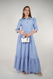 Vestido largo con botones y mangas abullonadas en los codos con contraste de rayas para mujer, con bolsillo lateral invisible y cinturón del mismo color.