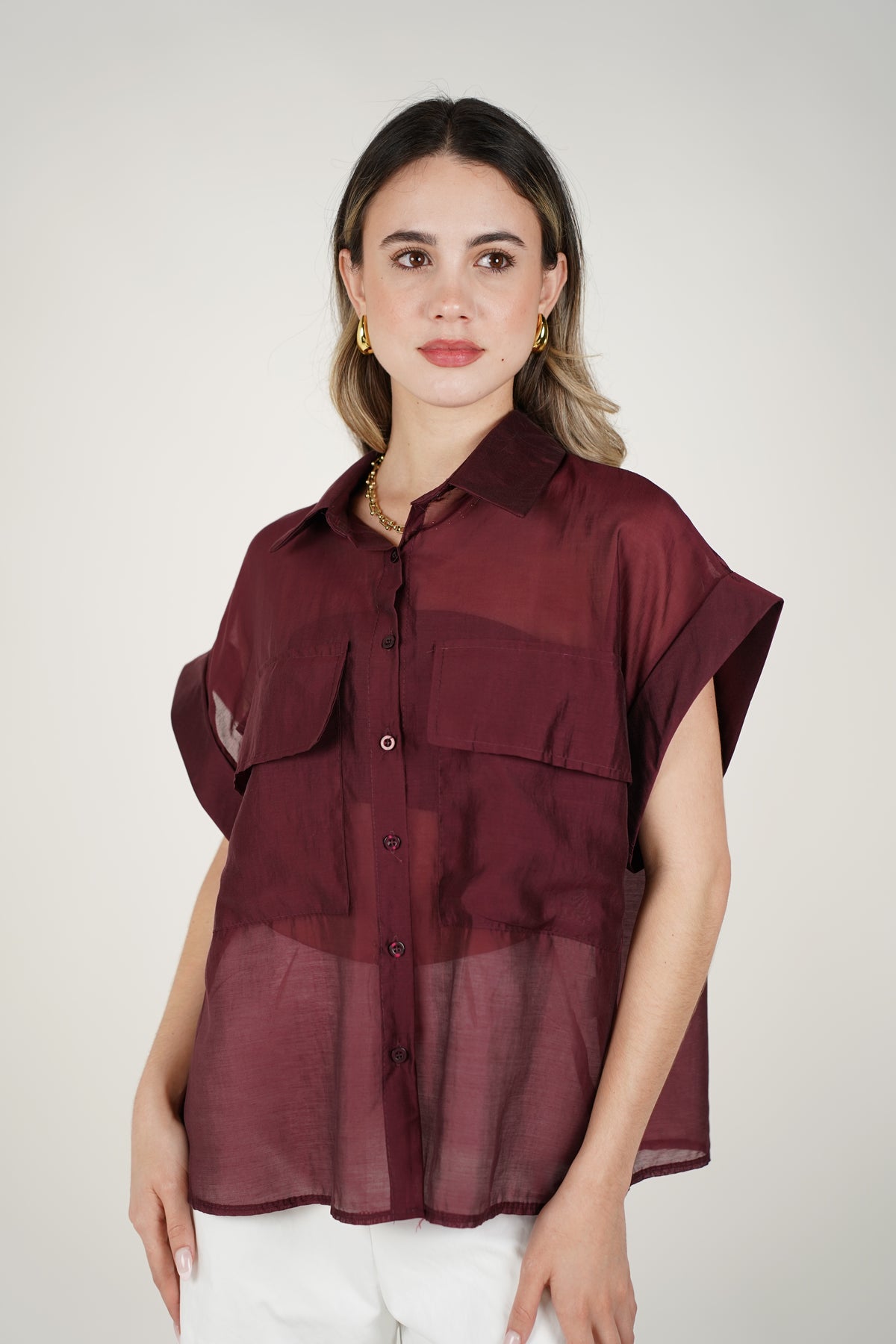 Make a statement with the Talira Button Down, a lightweight sheer black top with oversized pockets and a modern fit for day or night looks.