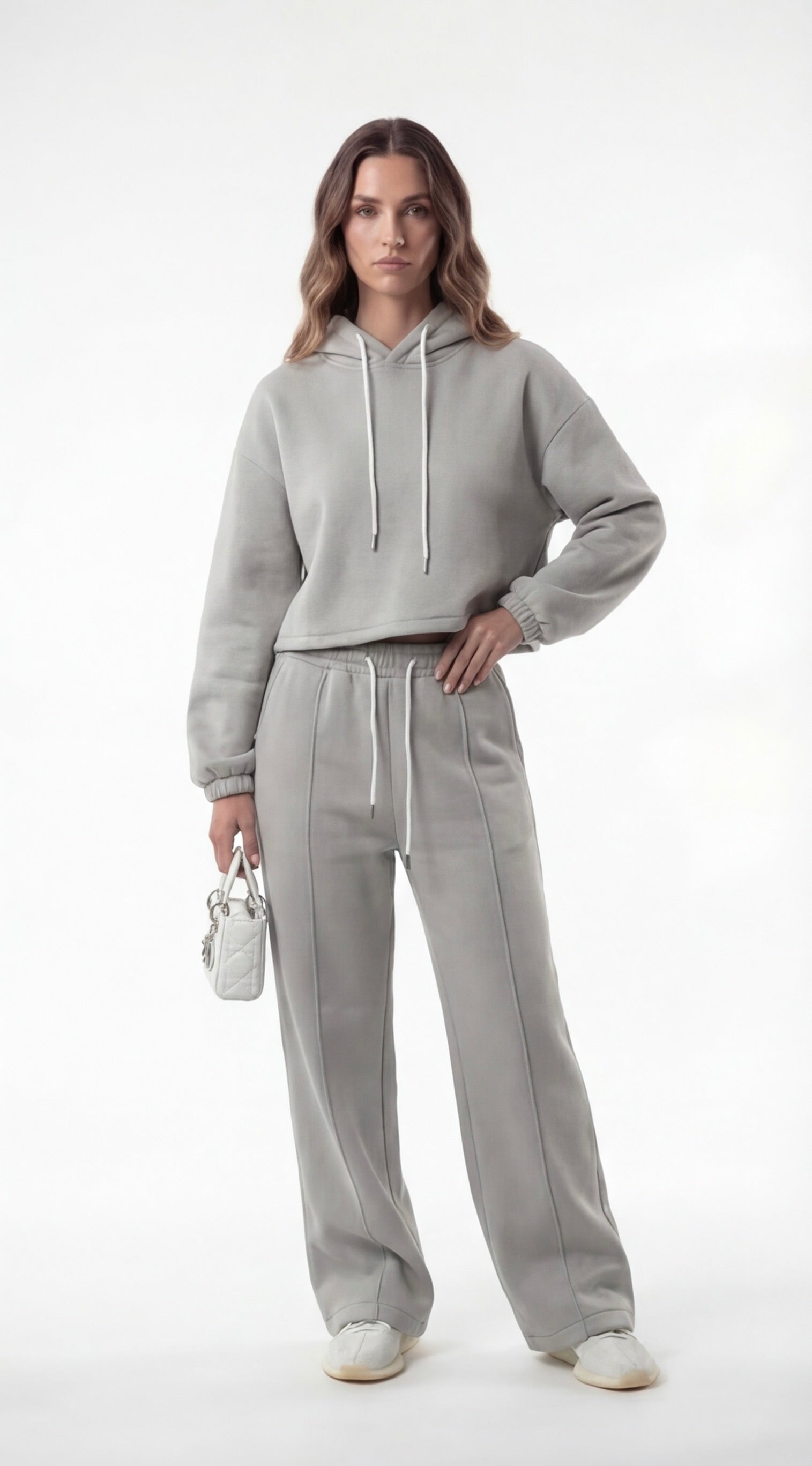 Moderno conjunto de descanso en color salvia con sudadera corta con capucha y pantalones de pierna ancha con cordón. El look athleisure elevado perfecto para una comodidad chic diaria.