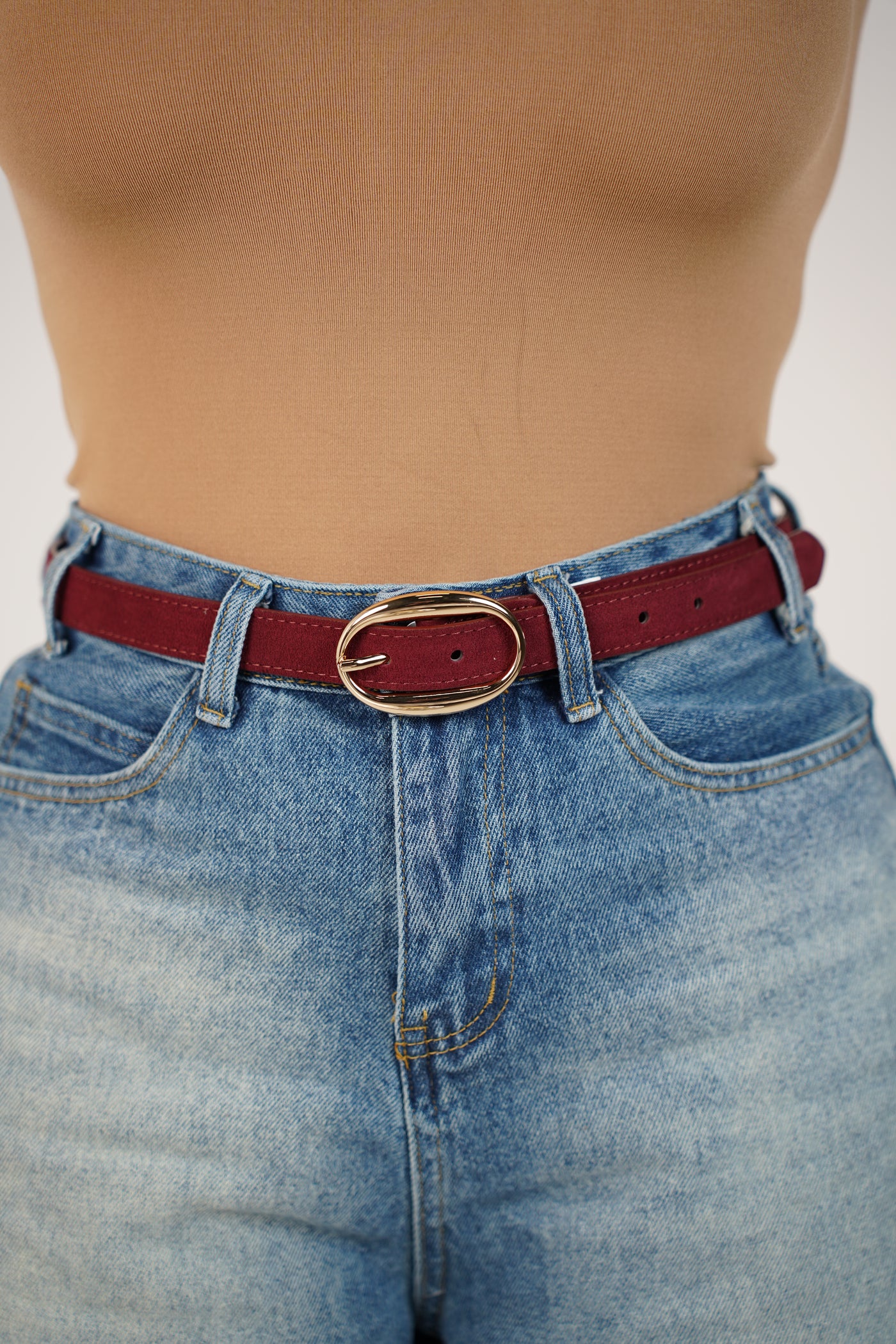 Belora Suede Thin Belt – wine red suede belt with gold oval buckle, also available in off-white