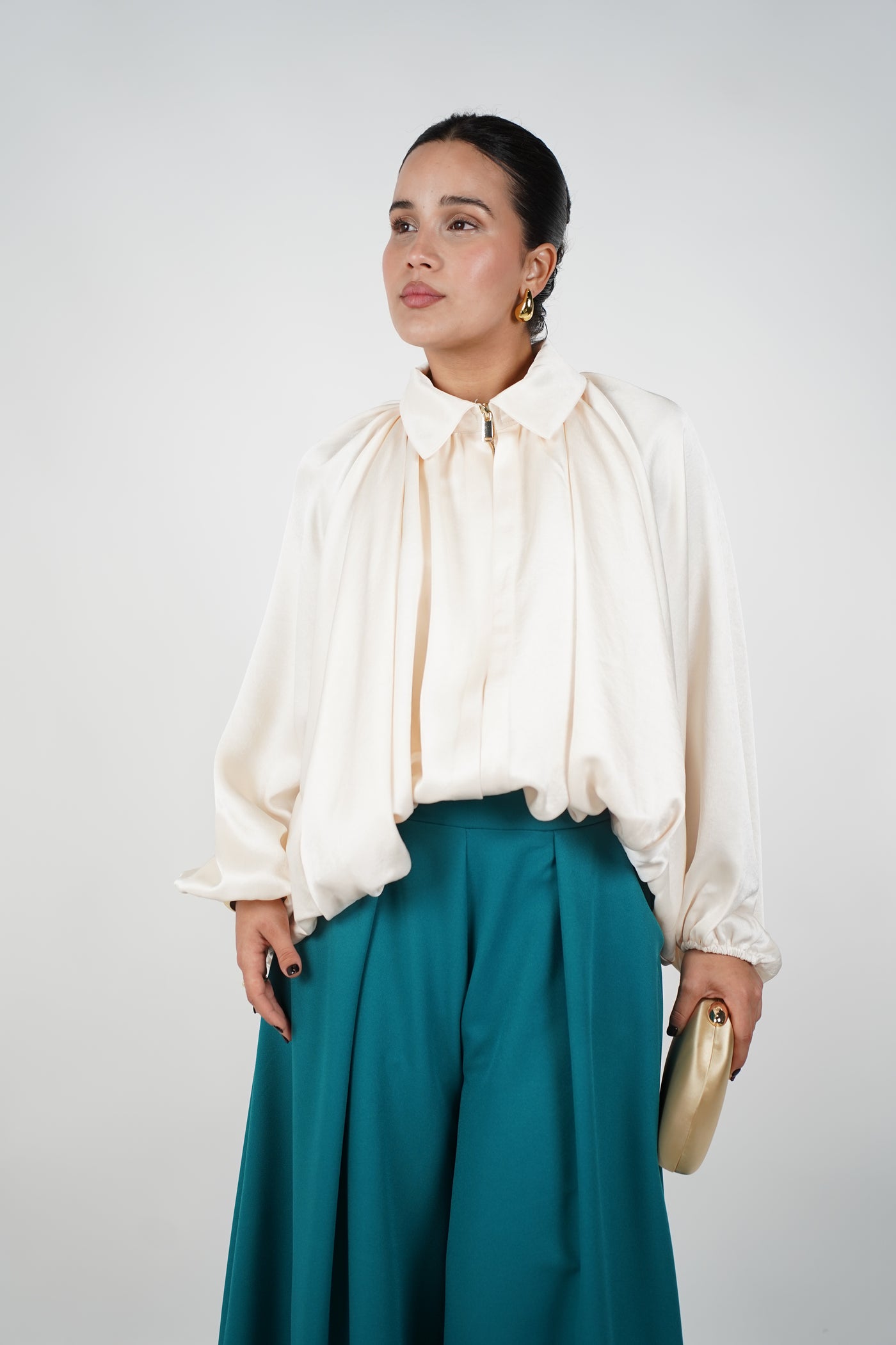 Voluminous satin zip-up bomber with bubble hem and gathered sleeves for a bold, elevated silhouette.