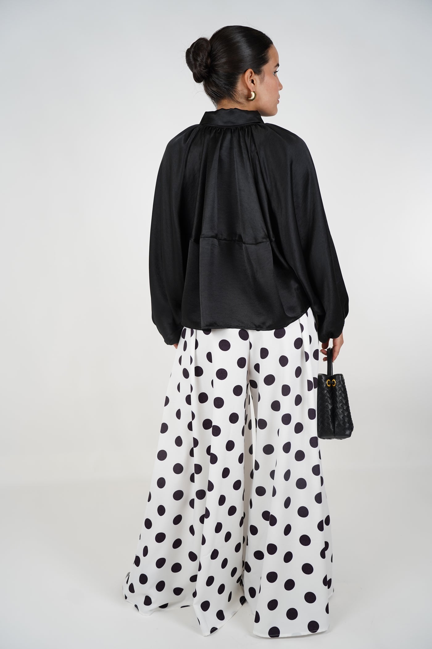 Model wearing black satin bubble bomber jacket with collar, paired with wide-leg polka dot pants and black handbag.