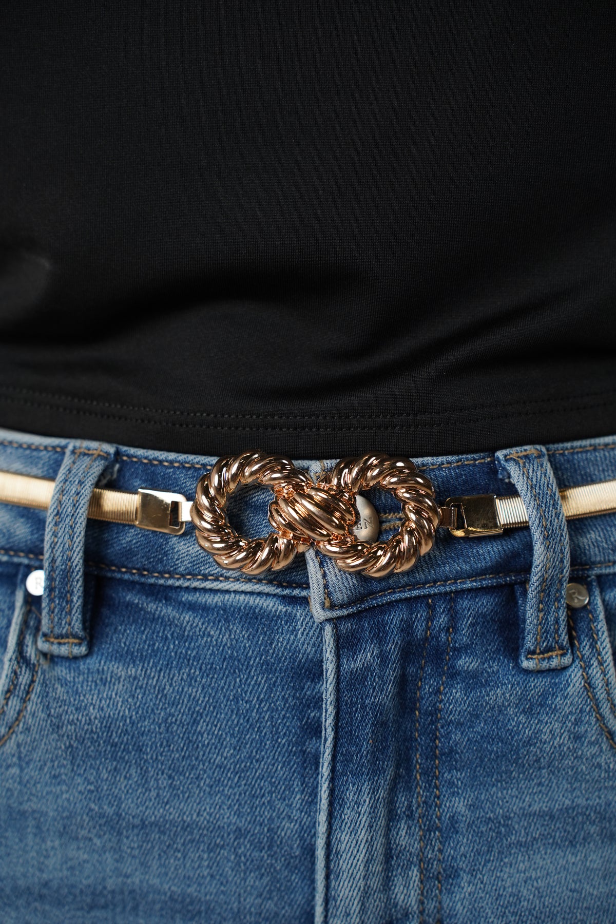 Gold elastic belt with rope-knot buckle styled over denim jeans