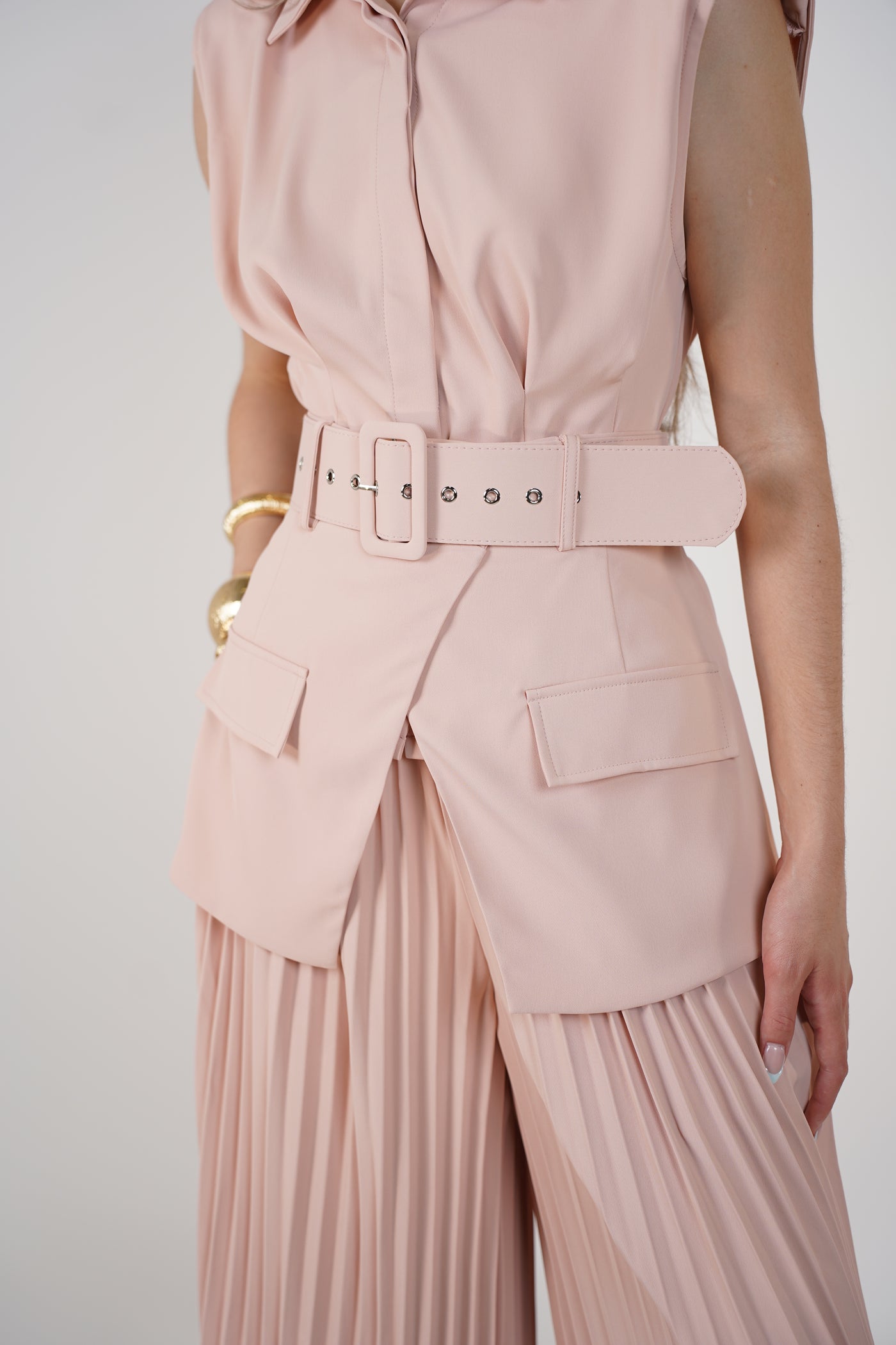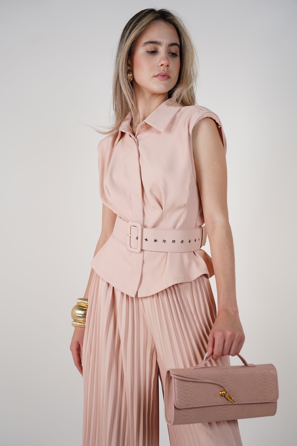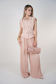 Meta Description: Shop the Elixir Pants Set in blush pink. Includes pleated wide-leg trousers and a structured belted top. Perfect for chic, effortless elegance.