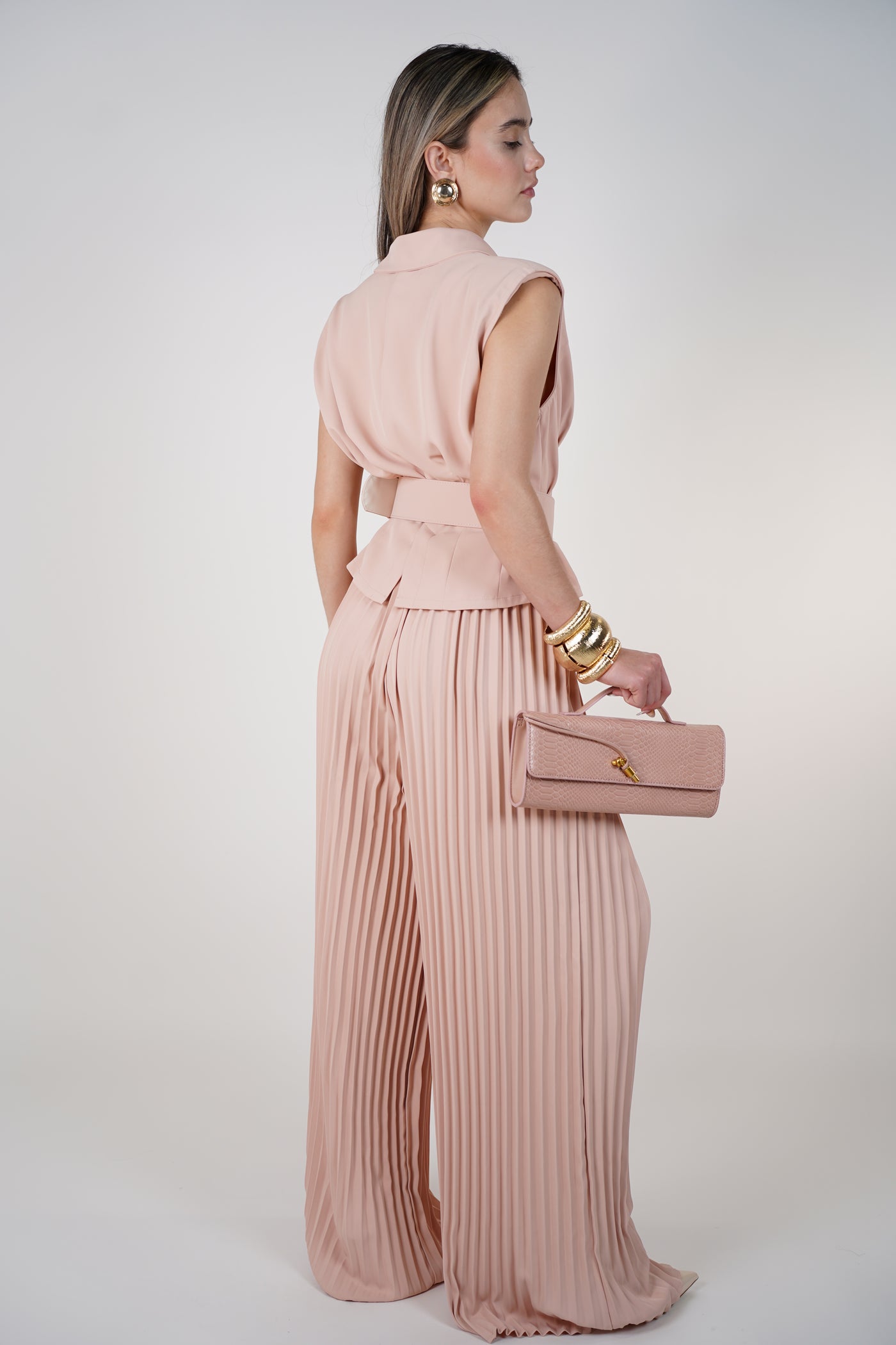 Model wearing blush pink pleated pants and a matching belted sleeveless top, styled with a pink clutch and gold accessories.