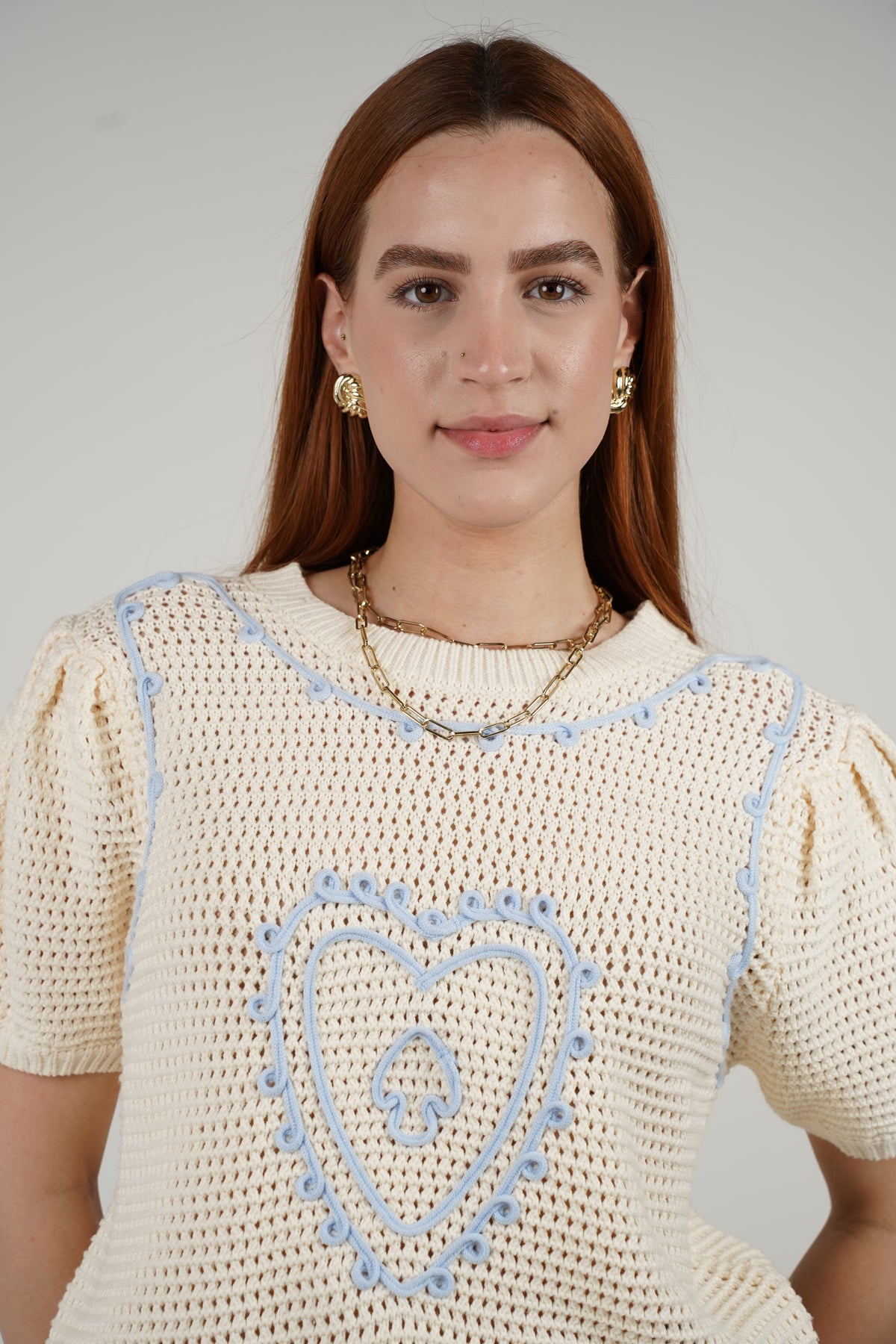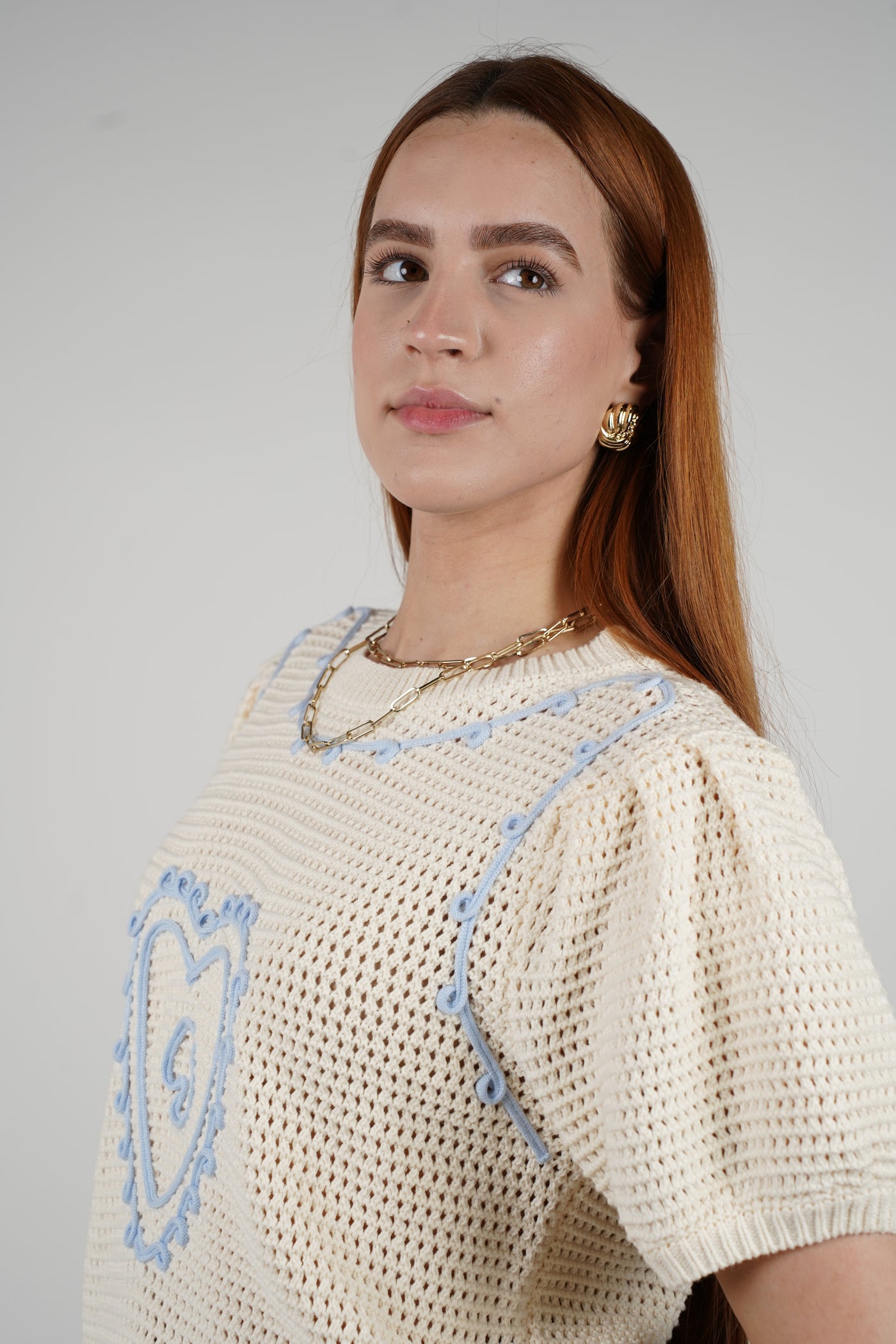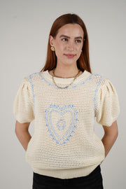 Evelyn Sweater – Cream Crochet with Baby Blue Accents