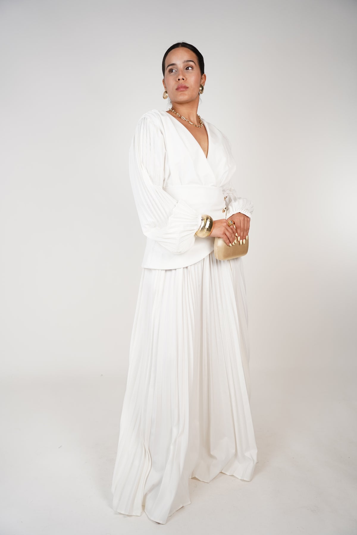 Model wearing the Jali Long Sleeve Formal Dress in white, featuring pleated skirt and wrap neckline with long cuffed sleeves.