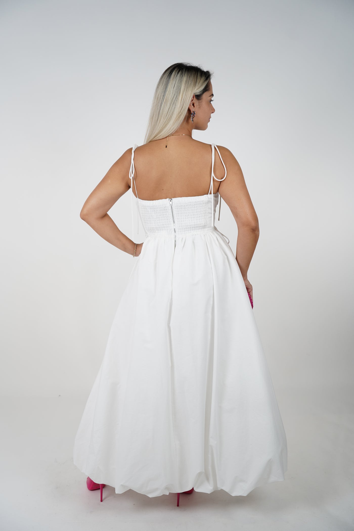 Model wearing a red maxi dress with covered buttons, thin tie straps, and a voluminous balloon hem, paired with black heels and gold bangles.