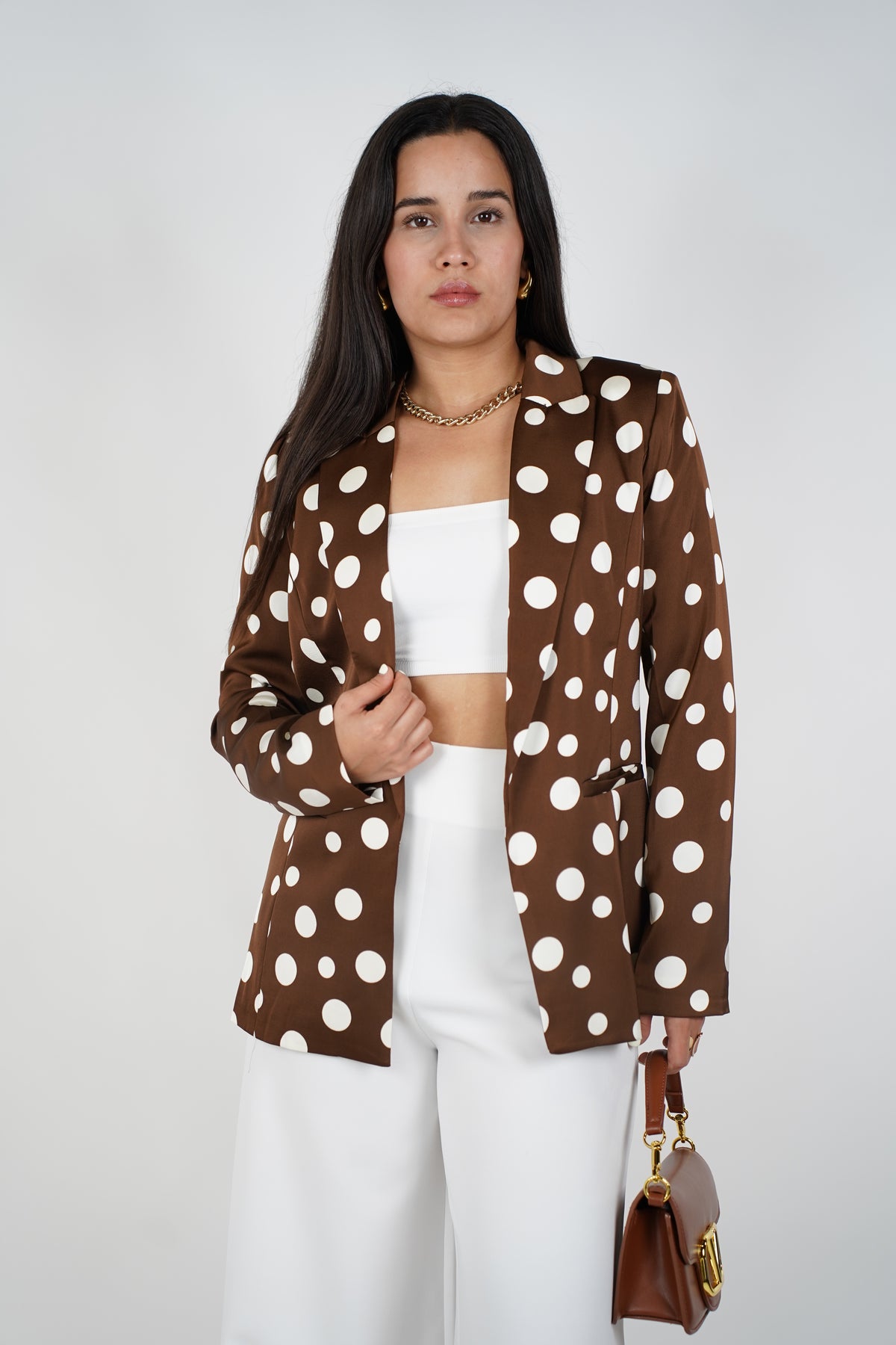 Classic meets modern in the Jareli Blazer, a silky statement piece with oversized polka dots and tailored edge.