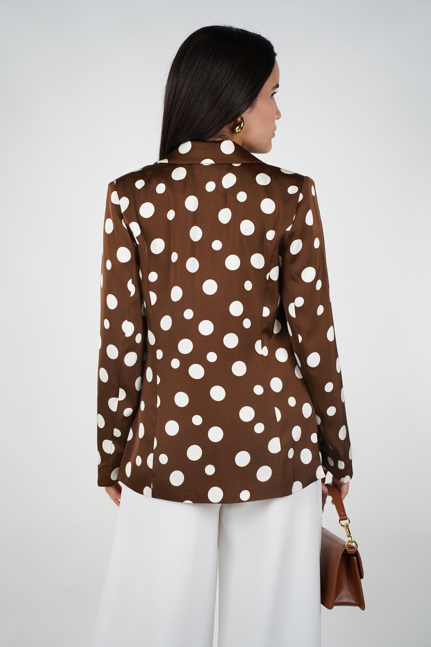 Meta Title: Jareli Polka Dot Blazer – Satin Statement Blazer with Bold Retro Print