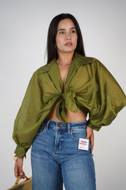 The Jena Sheer Blouse brings fresh energy to your wardrobe with its light fabric and edgy versatility. Styled here in a vibrant olive green and tied at the front, it’s the perfect top to throw over a bralette, tank, or swimsuit. The roomy sleeves and classic collar add structure, while the see-through finish keeps things playful and bold. Whether you're dressing it up or down, this blouse is a statement in any color.