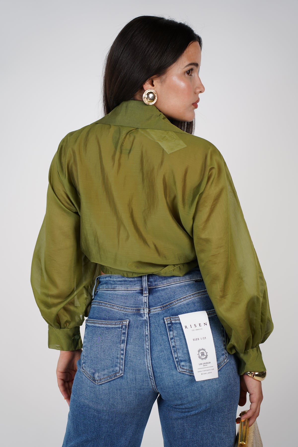 Woman wearing a sheer olive green blouse tied in the front with wide sleeves and blue jeans.