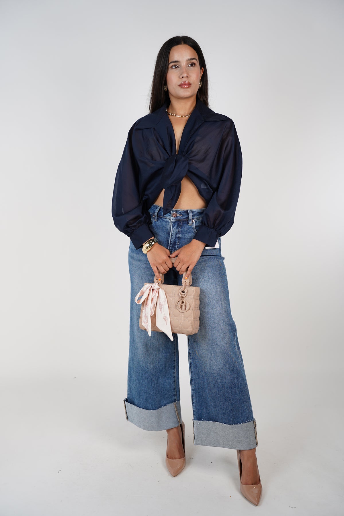Model is 5'6", wearing the blouse in olive green styled tied at the front with blue high-rise jeans.