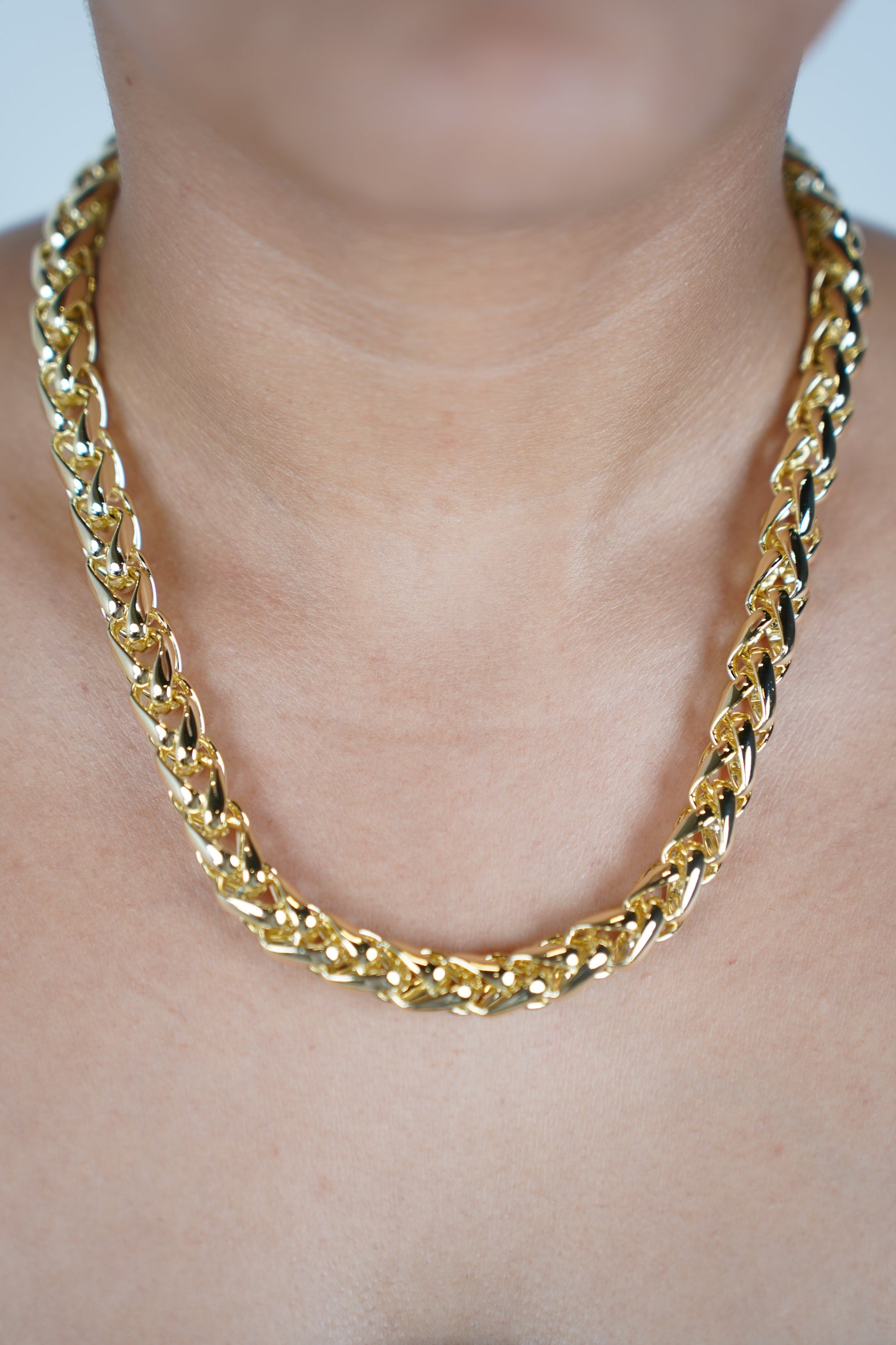 Model wears the necklace against bare skin to highlight the chunky shine and standout structure.