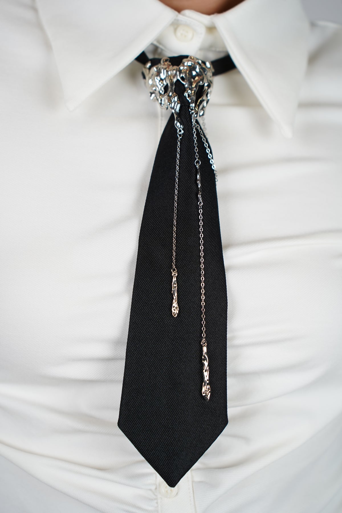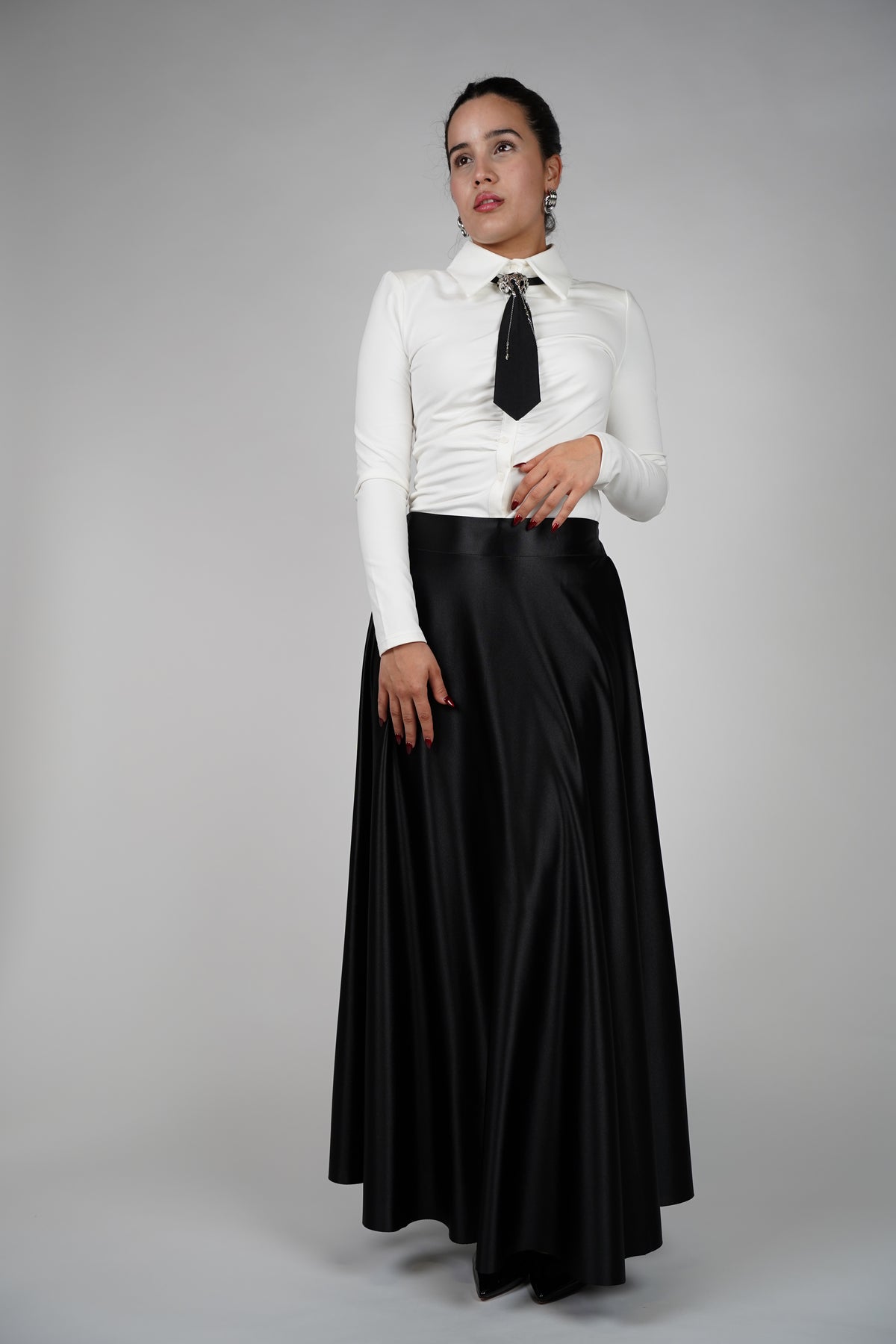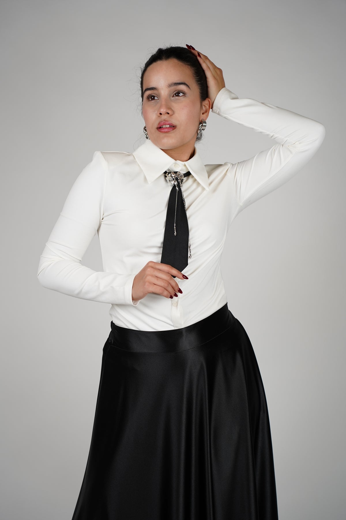 Alt text: Woman wearing cream satin button-down blouse with pointed collar and black tie, paired with black satin skirt.