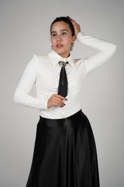The Kimiya Button Down – Sculpted Satin Stretch Shirt is the ultimate fusion of elegance and edge. Designed with a sharp, exaggerated collar and a satin-like sheen, this cream-colored blouse features a body-hugging silhouette with just the right amount of stretch for a comfortable, flattering fit. The bold structure is softened by the smooth texture, making it ideal for both office-ready looks and dressed-up evenings. Whether layered under a blazer or styled solo with wide-leg trousers or skirts, Kimiya adds instant polish and personality to any outfit.