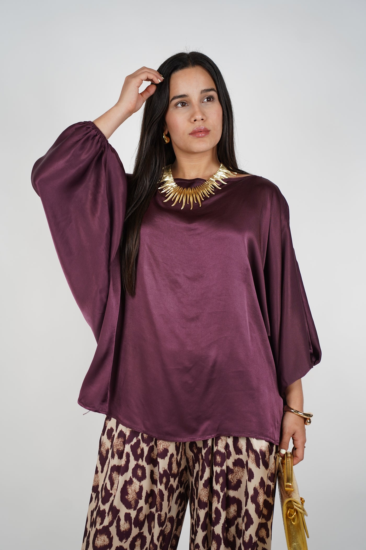 A luxe plum satin blouse with relaxed volume and elevated shine for everyday glam or evening finesse.