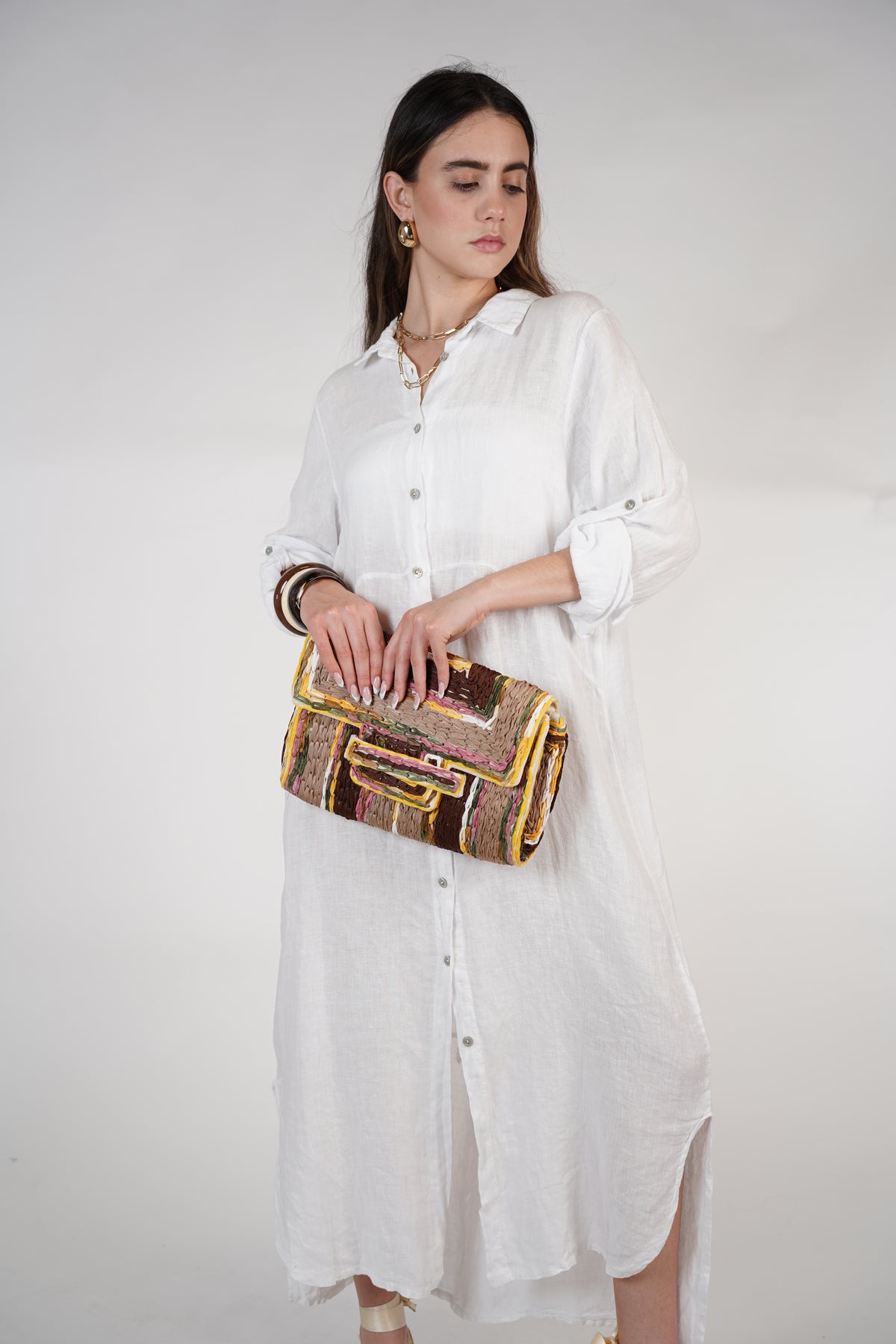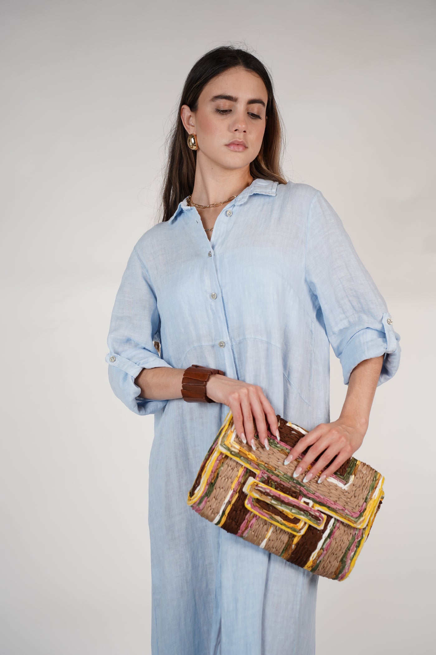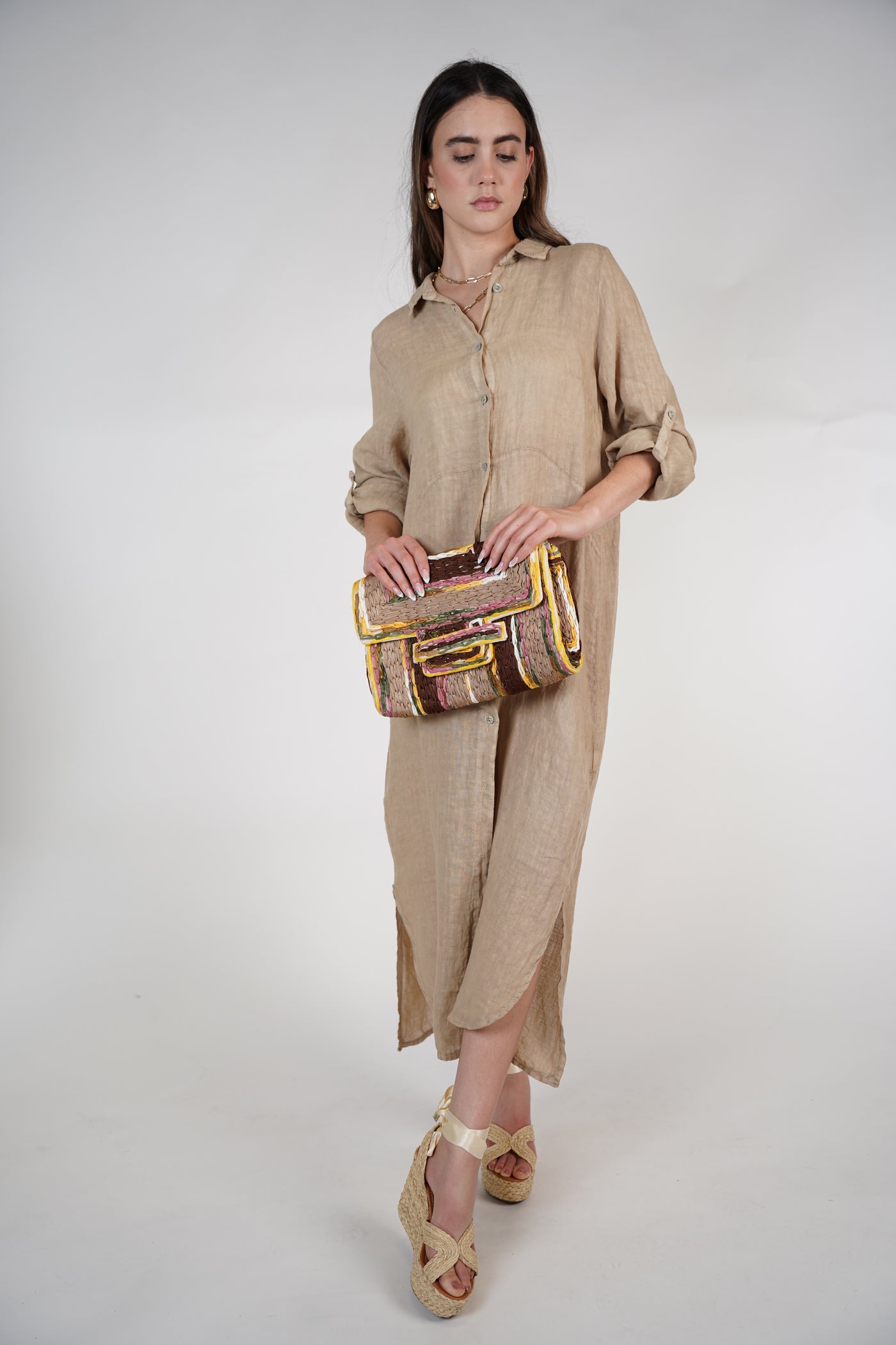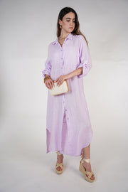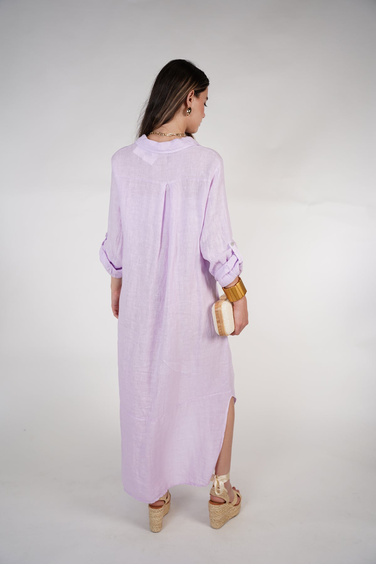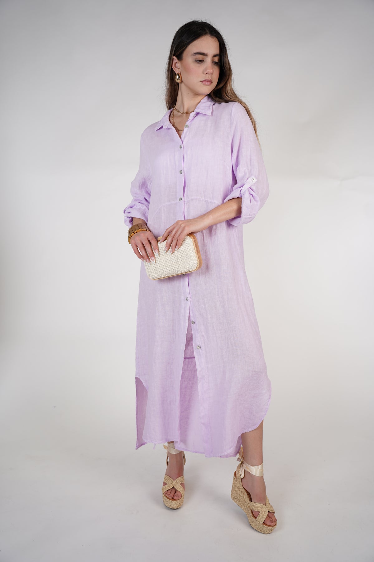 Model wearing lilac linen maxi shirt dress with long rolled sleeves and a button-down front, styled with espadrille wedges and a neutral clutch