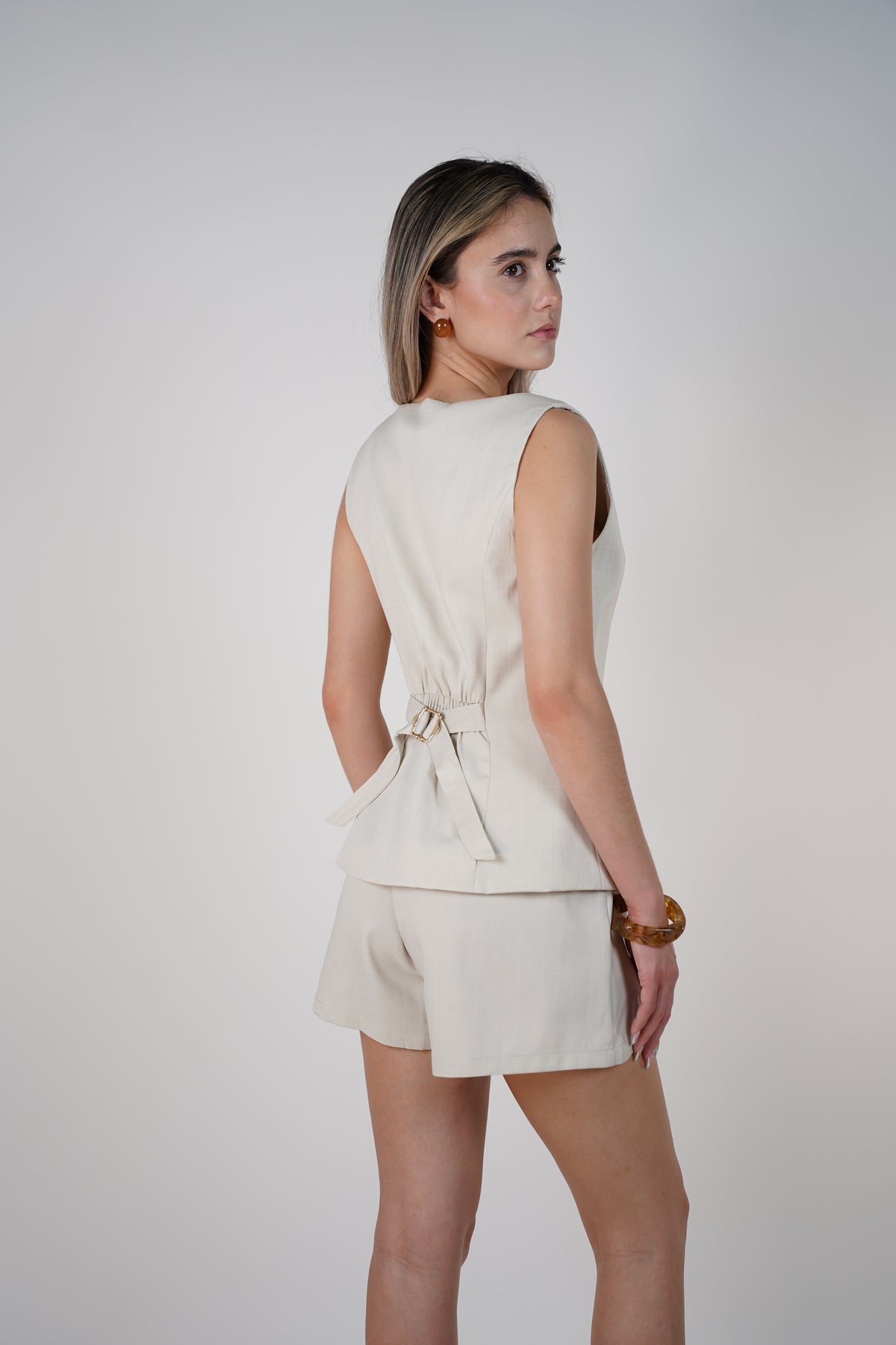 Meta Description: The Mavi Vest Shorts Set features a sleeveless vest with statement buttons and high-waisted shorts. A modern and minimal summer look in sleek neutral tones.