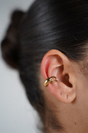 A bold yet minimal gold ear cuff with a polished crossover design that adds instant edge without a piercing.