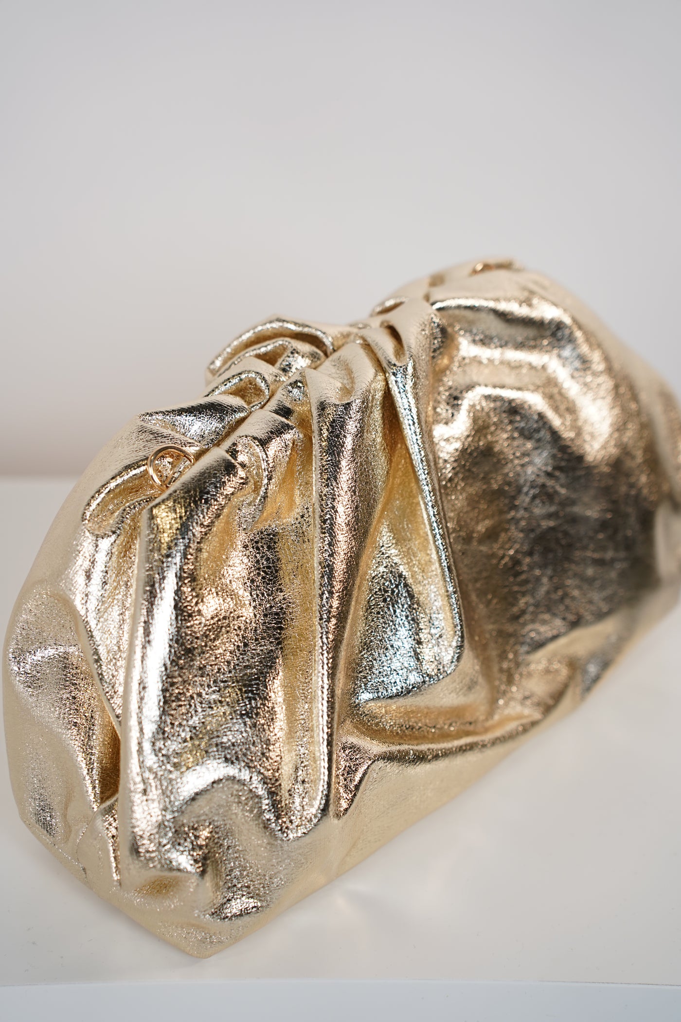 A soft, metallic clutch with a ruched design that adds effortless glamour to any look.
